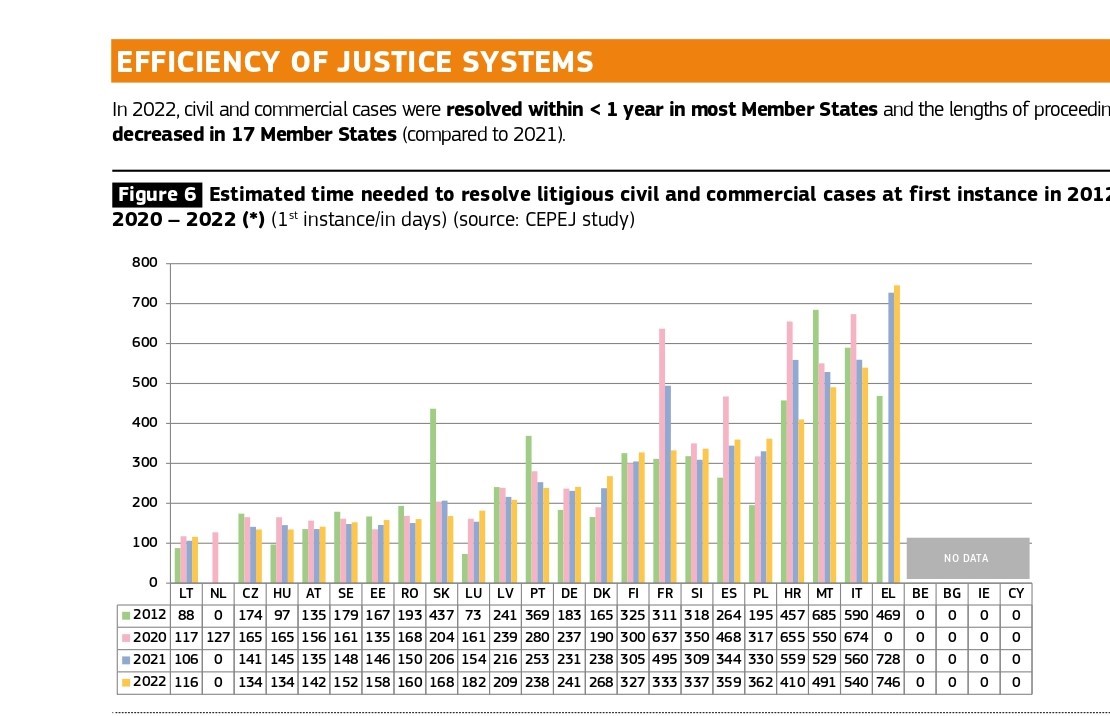 Οι καθυστερήσεις στην έκδοση αποφάσεων στην πολιτική Δικαιοσύνη αποτελούν τον κανόνα και μάστιγα, όπως αποδεικνύεται από τα σχετικά στοιχεία της αρμόδιας επιτροπής CEPEJ της Ε.Ε. (επισυνάπτεται), σύμφωνα με τα οποία ο χρόνος απονομής της αστικής δικαιοσύνης είναι 746 ημέρες, τη στιγμή που ο ευρωπαϊκός μέσος όρος είναι 282,14 ημέρες. Για τις άνω καθυστερήσεις στην απονομή της Δικαιοσύνης η χώρα μας έχει καταδικασθεί επανειλημμένως από το ΕΔΔΑ, κατέχουσα μια από τις πρώτες θέσεις στο σχετικό πίνακα. Από τη χθεσινή απάντηση της Πρόεδρου του Αρείου Πάγου, δια του εκπροσώπου τύπου του Δικαστηρίου, μετά την ανάδειξη της ενδεικτικής των καθυστερήσεων στον Άρειο Πάγο