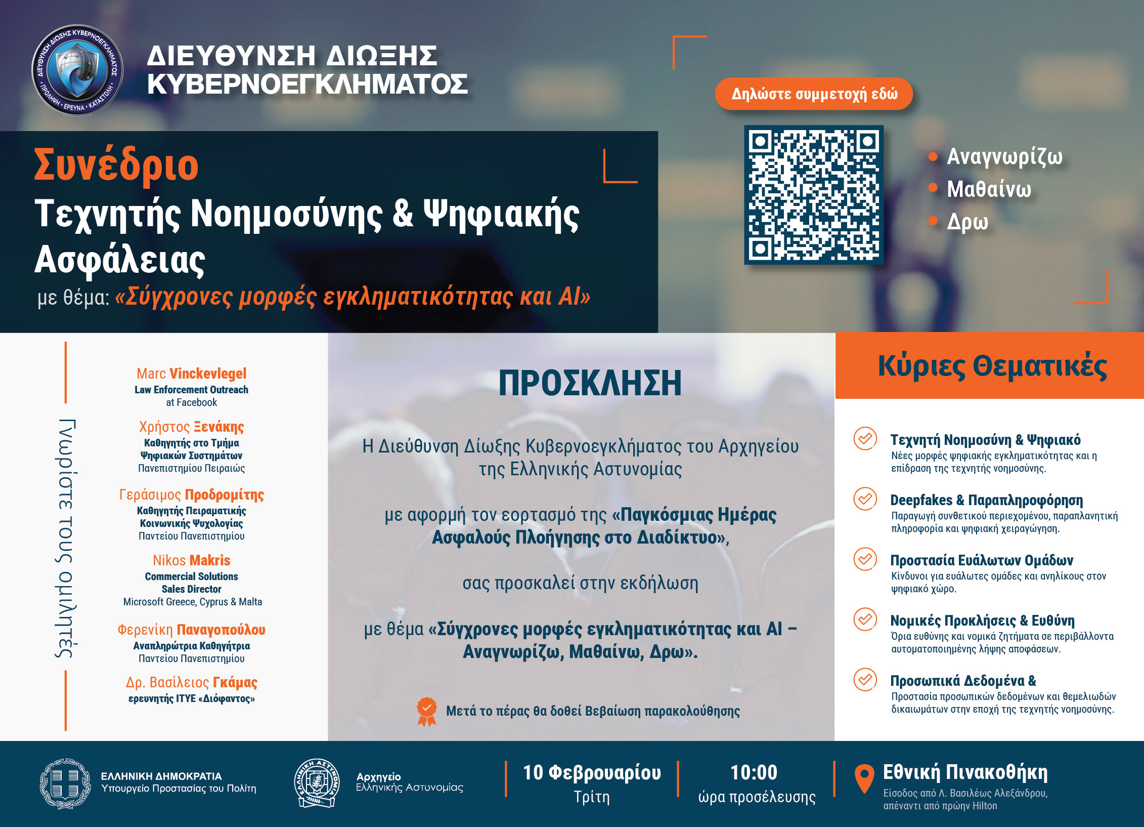 Η συζήτηση που θα αναπτυχθεί στο πλαίσιο του συνεδρίου αποκτά ιδιαίτερη σημασία στη σημερινή εποχή, καθώς η ραγδαία εξέλιξη της τεχνητής νοημοσύνης μεταβάλλει ριζικά τον τρόπο τέλεσης του εγκλήματος, την αξιοπιστία της ψηφιακής πληροφορίας και τα όρια μεταξύ πραγματικού και τεχνητού. Τα συμπεράσματα που θα προκύψουν, μέσα από τη συνάντηση θεσμικών φορέων, της δικαιοσύνης, της ακαδημαϊκής κοινότητας και των ψηφιακών πλατφορμών, ευελπιστούμε ότι θα συμβάλλουν ουσιαστικά στη διαμόρφωση κοινής αντίληψης, στη χάραξη πολιτικών πρόληψης, στην ενίσχυση της θεσμικής και επιχειρησιακής ετοιμότητας απέναντι στις νέες ψηφιακές απειλές με σεβασμό στα θεμελιώδη δικαιώματα των χρηστών, την ιδιωτικότητα και την ασφάλεια στον ψηφιακό χώρο.