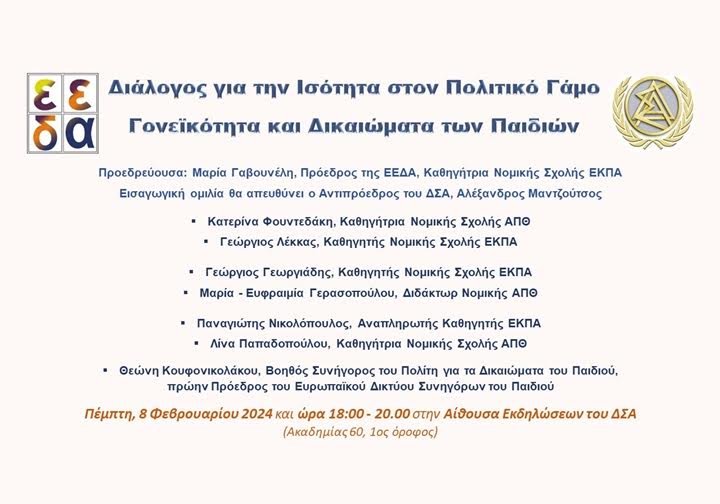 Η Εθνική Επιτροπή για τα Δικαιώματα του Ανθρώπου (ΕΕΔΑ) και ο Δικηγορικός Σύλλογος Αθηνών (ΔΣΑ) σας προσκαλούν στην επιστημονική ημερίδα που διοργανώνουν την Πέμπτη 8 Φεβρουαρίου 2024 και ώρα 18:00-20.00 στην Αίθουσα Εκδηλώσεων του ΔΣΑ (Ακαδημίας 60, 1ος όροφος) με θέμα: