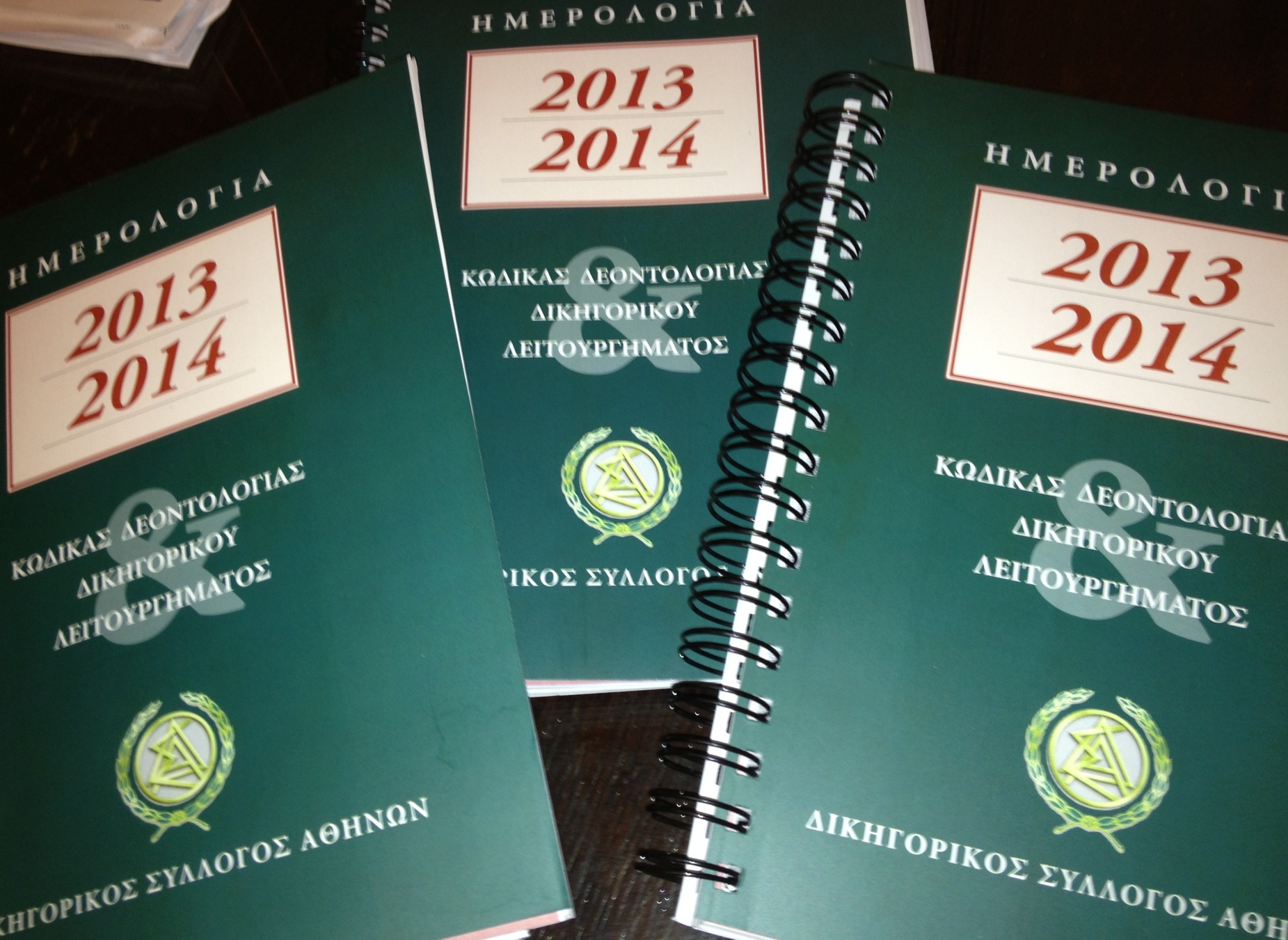 Ενημερώνουμε τους συναδέλφους ότι από αύριο, Τετάρτη 19 Δεκεμβρίου 2012, θα αρχίσει να διανέμεται στους Δικηγόρους και στους Ασκουμένους, μέλη του ΔΣΑ, το νέο ημερολόγιο διετίας (2013-2014) του Συλλόγου μας, ενός καθιερωμένου, πρακτικού και εύχρηστου εργαλείου για την καθημερινή δικαστηριακή πραγματικότητα, που έχει ως στόχο να διευκολύνει το μέσο συνάδελφο, ο οποίος είναι πλέον – εκ των πραγμάτων – υποχρεωμένος να βαδίζει με ορίζοντα πολυετίας προκειμένου να διεκπεραιώνει τις διαδικαστικές πράξεις που του ανατίθενται με επιμέλεια και αφορούν σε κάθε στάδιο της δίκης.