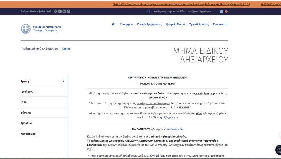 Κατόπιν σχετικής επικοινωνίας του ΔΣΑ με τον Υφυπουργό Εσωτερικών κ. Β. Π. Σπανάκη και με τον Γενικό Γραμματέα Εσωτερικών και Οργάνωσης κ. Α. Μπαλέρμπα αρμόδιο για τα θέματα του Ειδικού Ληξιαρχείου, ενημερώνουμε τους συναδέλφους ότι πλέον παρέχεται η δυνατότητα για κλείσιμο ραντεβού και μέσω τηλεφώνου, ώστε να μη προσέρχονται από το πρωί εκεί για να πάρουν («χαρτάκι») σειρά προτεραιότητας.