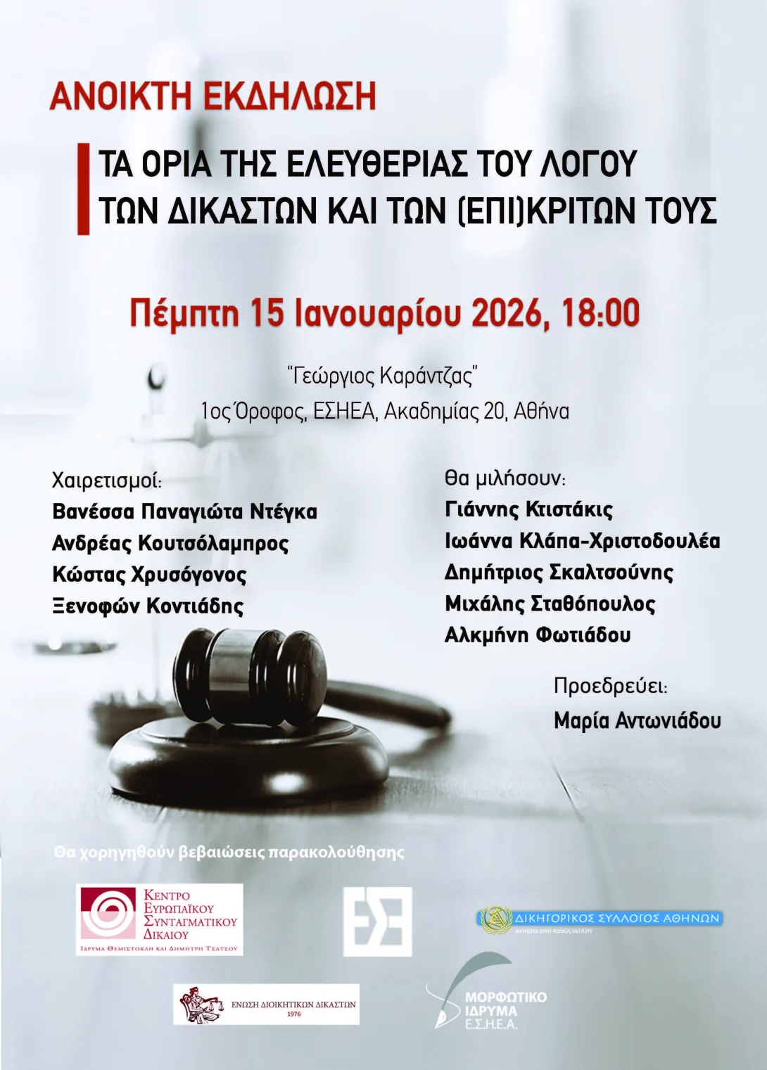 Το Ίδρυμα Θεμιστοκλή & Δημήτρη Τσάτσου – Κέντρο Ευρωπαϊκού Συνταγματικού Δικαίου και η Ένωση Ελλήνων Συνταγματολόγων, σε συνεργασία με την Ένωση Διοικητικών Δικαστών, τον Δικηγορικό Σύλλογο Αθηνών και το Μορφωτικό Ίδρυμα της ΕΣΗΕΑ, σας προσκαλούν στην εκδήλωση με θέμα «Τα όρια της ελευθερίας του λόγου των δικαστών και των (επι)κριτών τους», την Πέμπτη 15 Ιανουαρίου 2026 στην Αίθουσα «Γεώργιος Καράντζας» 1ος όροφος, της ΕΣΗΕΑ, Ακαδημίας 20, Αθήνα και ώρα 18:00.