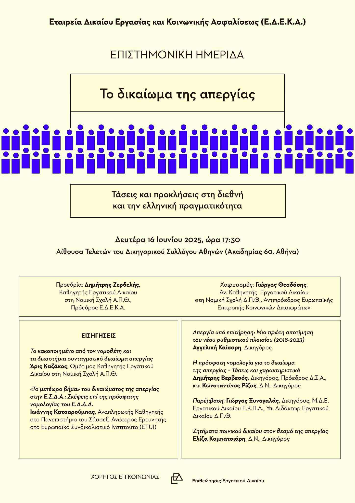 Η Εταιρεία Δικαίου Εργασίας και Κοινωνικής Ασφαλίσεως (ΕΔΕΚΑ) διοργανώνει Επιστημονική Ημερίδα με θέμα "Το δικαίωμα της απεργίας - Τάσεις και προκλήσεις στη διεθνή και την ελληνική πραγματικότητα" την Δευτέρα 16 Ιουνίου 2025 ώρα 17:30 στην αίθουσα τελετών "Μιχάλης Ζαφειρόπουλος" του Δικηγορικού Συλλόγου Αθηνών (Ακαδημίας 60, 1ος όροφος).