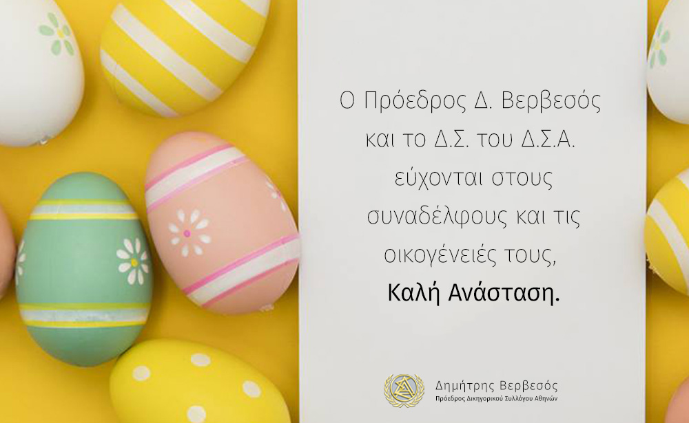 Ο Πρόεδρος του ΔΣΑ, Δημήτρης Βερβεσός και τα μέλη του ΔΣ εύχονται στους συναδέλφους και τις οικογένειές τους Καλή Ανάσταση.