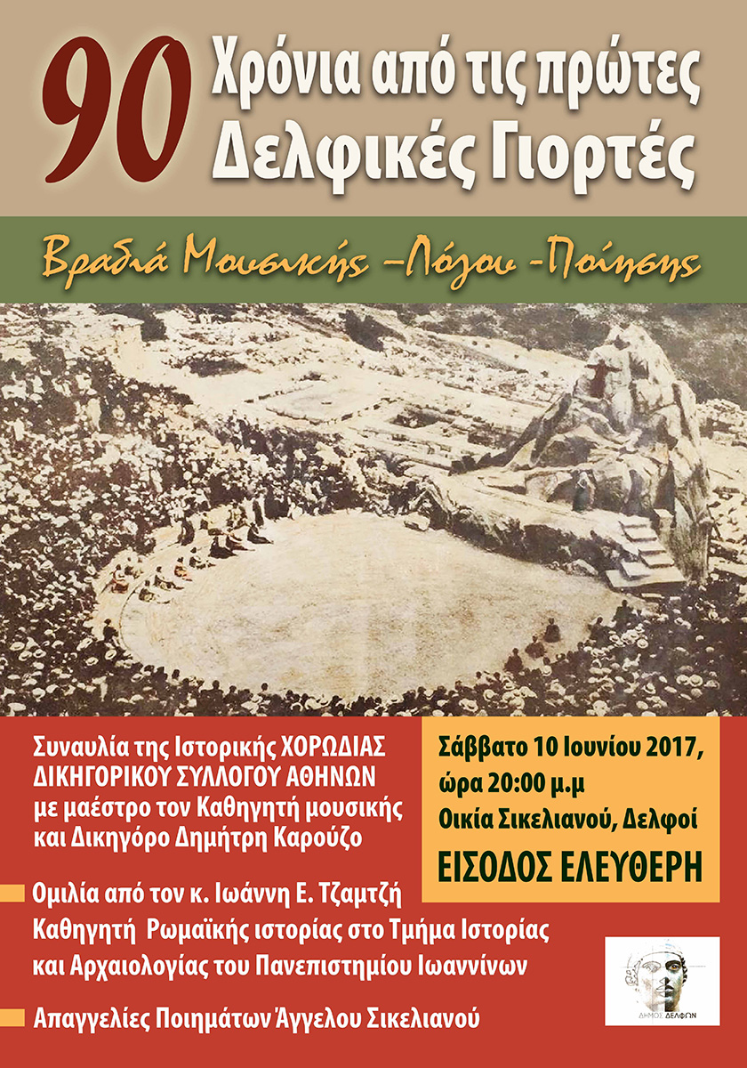 Η Ιστορική ΧΟΡΩΔΙΑ ΤΟΥ ΔΙΚΗΓΟΡΙΚΟΥ ΣΥΛΛΟΓΟΥ ΑΘΗΝΩΝ, αποδέχθηκε την τιμητική πρόσκληση του Δήμου Δελφών και θα λάβει μέρος στην εκδήλωση «90 χρόνια από τις πρώτες Δελφικές γιορτές», η οποία θα πραγματοποιηθεί στους Δελφούς το Σάββατο 10 Ιουνίου 2017 και ώρα 20:00, στο σπίτι του μεγάλου μας Ποιητή ΄Αγγελου Σικελιανού.
