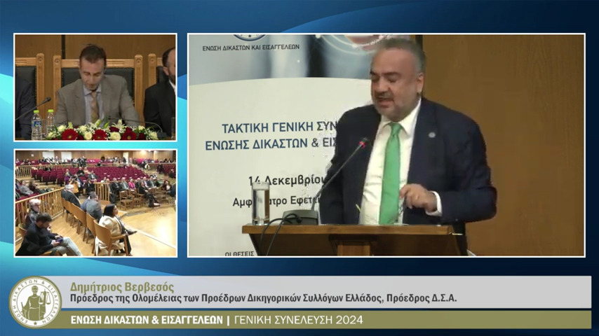 Επισυνάπτεται ο χαιρετισμός του Προέδρου της Ολομέλειας των Προέδρων των Δικηγορικών Συλλόγων Ελλάδος (και Προέδρου του ΔΣΑ) Δ. Βερβεσού στην σημερινή (14-12) Γενική Συνέλευση της ΄Ενωσης Δικαστών και Εισαγγελέων.