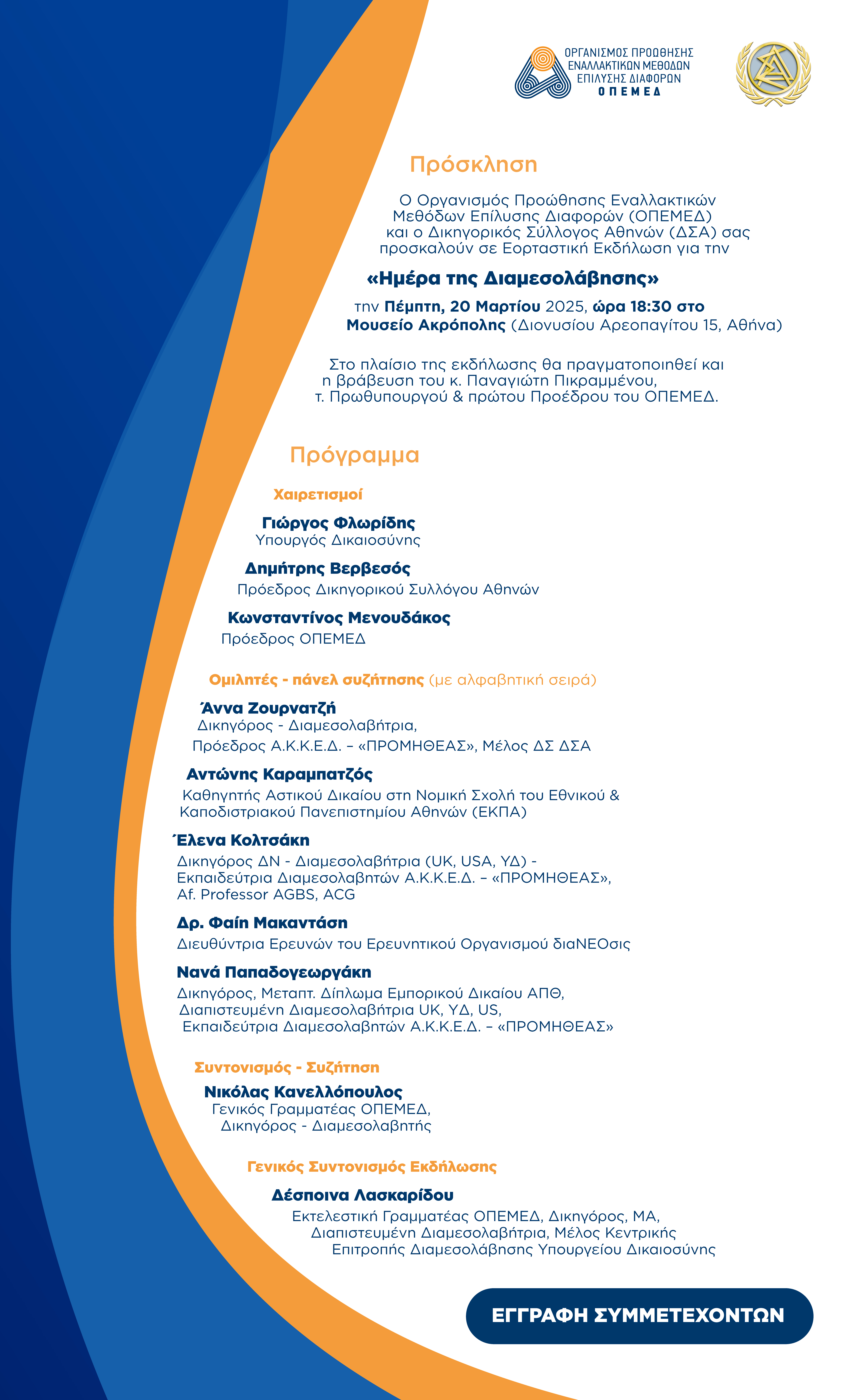 Eκδήλωση για την Ημέρα της Διαμεσολάβησης θα πραγματοποιηθεί στο Μουσείο της Ακρόπολης 20 Μαρτίου 2025 και ώρα 18:00 με συνδιοργανωτές ο ΟΠΕΔΕΜ και ο ΔΣΑ