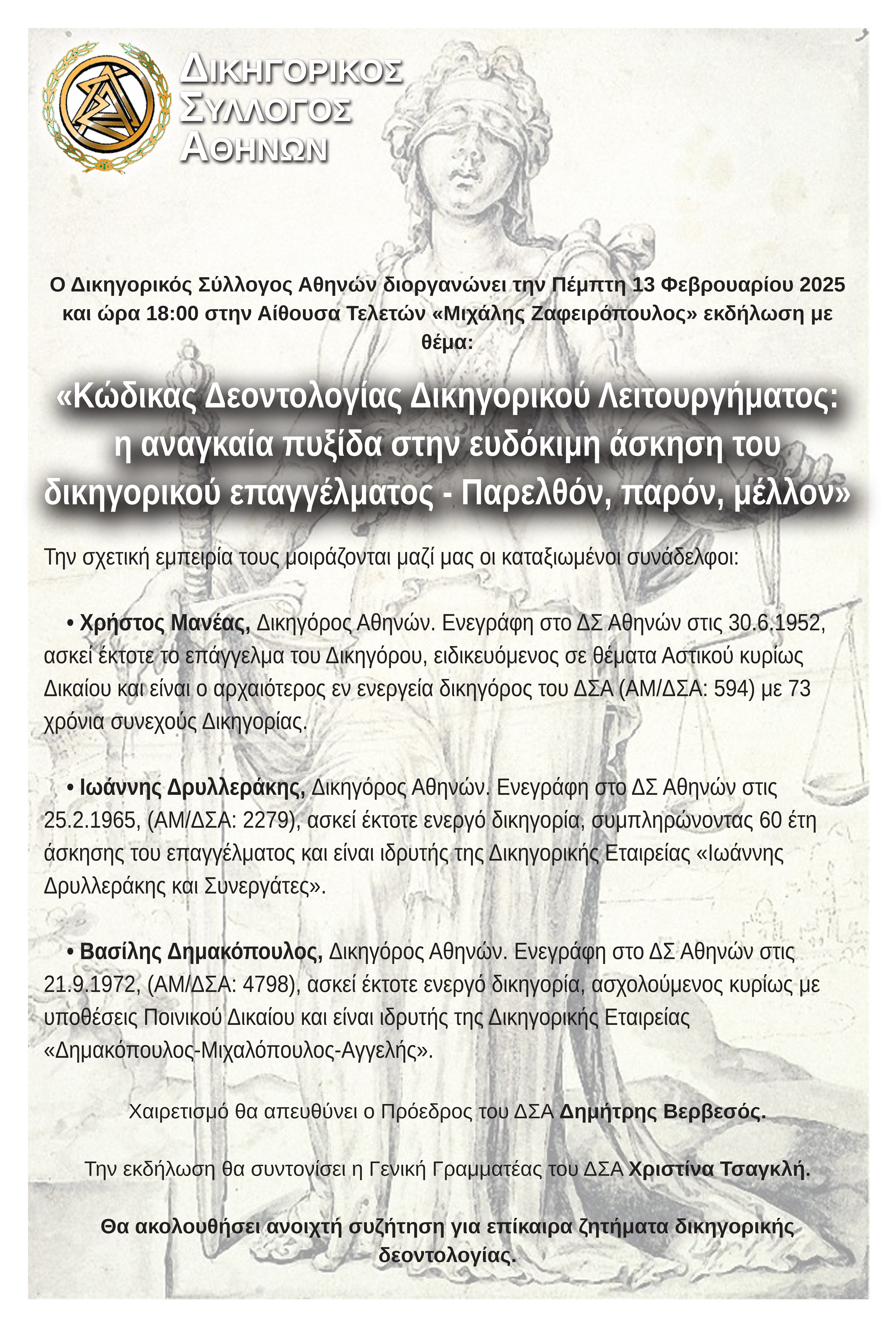 Ο Δικηγορικός Σύλλογος Αθηνών διοργανώνει την Πέμπτη 13 Φεβρουαρίου 2025 και ώρα 18:00 στην Αίθουσα Τελετών «Μιχάλης Ζαφειρόπουλος» εκδήλωση με θέμα: «Κώδικας Δεοντολογίας Δικηγορικού Λειτουργήματος: η αναγκαία πυξίδα στην ευδόκιμη άσκηση του δικηγορικού επαγγέλματος - Παρελθόν, παρόν, μέλλον»