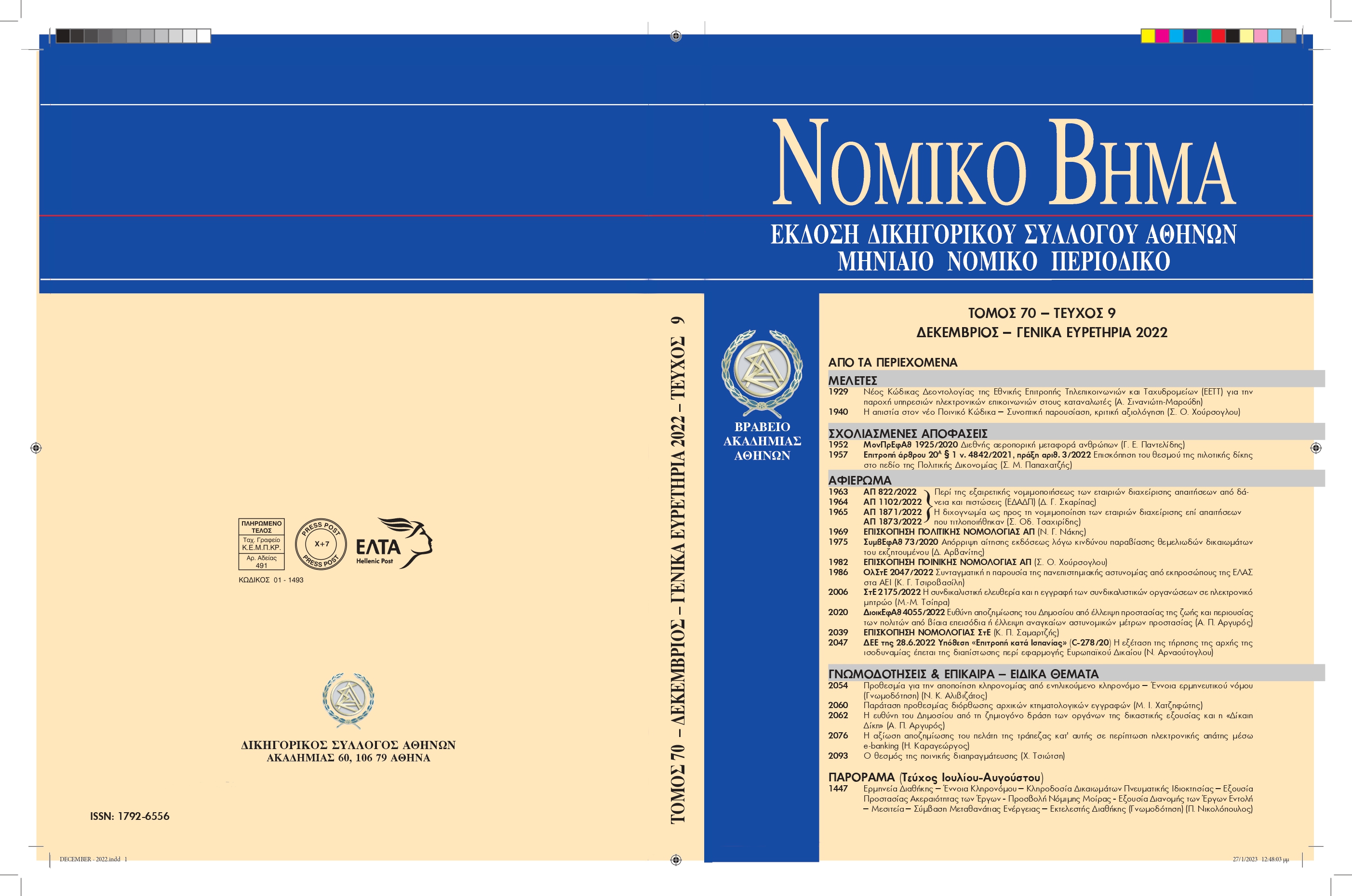 Το Νομικό Βήμα του Δεκεμβρίου (Τόμος 70 - τεύχος 9)