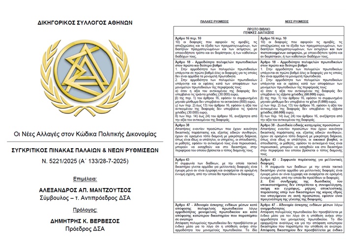 Αναρτάται συγκριτικός πίνακας με τις τροποποιήσεις που επέρχονται στο αστικό δικονομικό δίκαιο, με το Ν. 5221/2025 (Α΄ 133/28-7-2025).