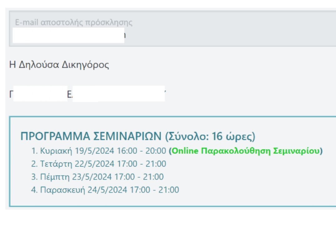 Λόγω του μεγάλου αριθμού συμμετοχής των δικηγόρων στα πρώτα Ειδικά Σεμινάρια Επιμόρφωσης του Ν. 5095/2024 (την Κυριακή 19/05/2024 το σεμινάριο για τα ΣΩΜΑΤΕΙΑ το παρακολούθησαν 9.334 και των ΠΡΟΣΗΜΕΙΩΣΕΩΝ 11.143), εμφανίστηκαν ορισμένα προβλήματα που οφείλονται κύρια στην αποστολή και λήψη του σχετικού συνδέσμου μέσω Email.