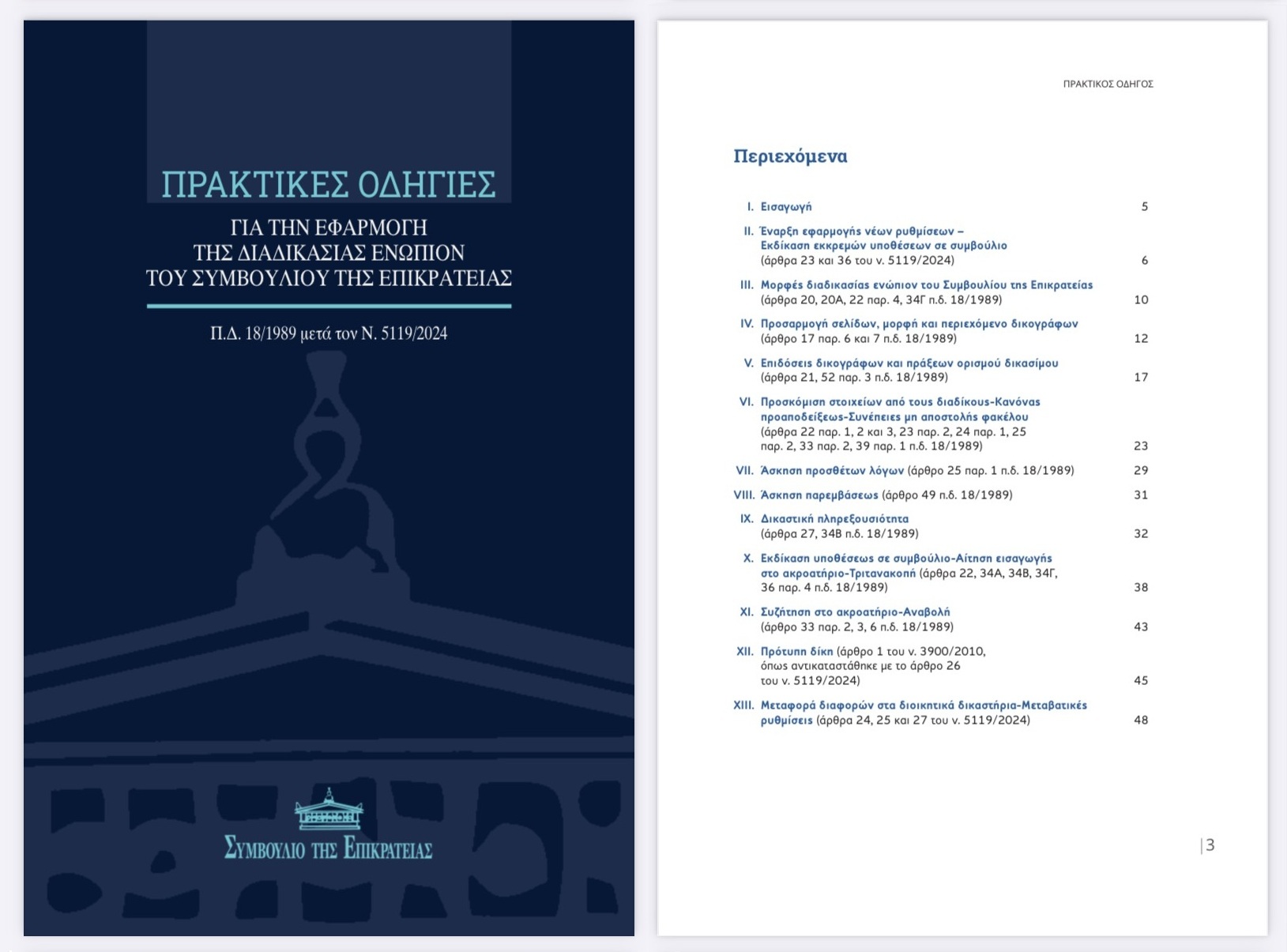 Προς διευκόλυνση των συναδέλφων αναρτάται σε ηλεκτρονική μορφή ο Πρακτικός Οδηγός του Συμβουλίου της Επικρατείας για την εφαρμογή της διαδικασίας ενώπιον του Δικαστηρίου μετά το Ν. 5119/2024.