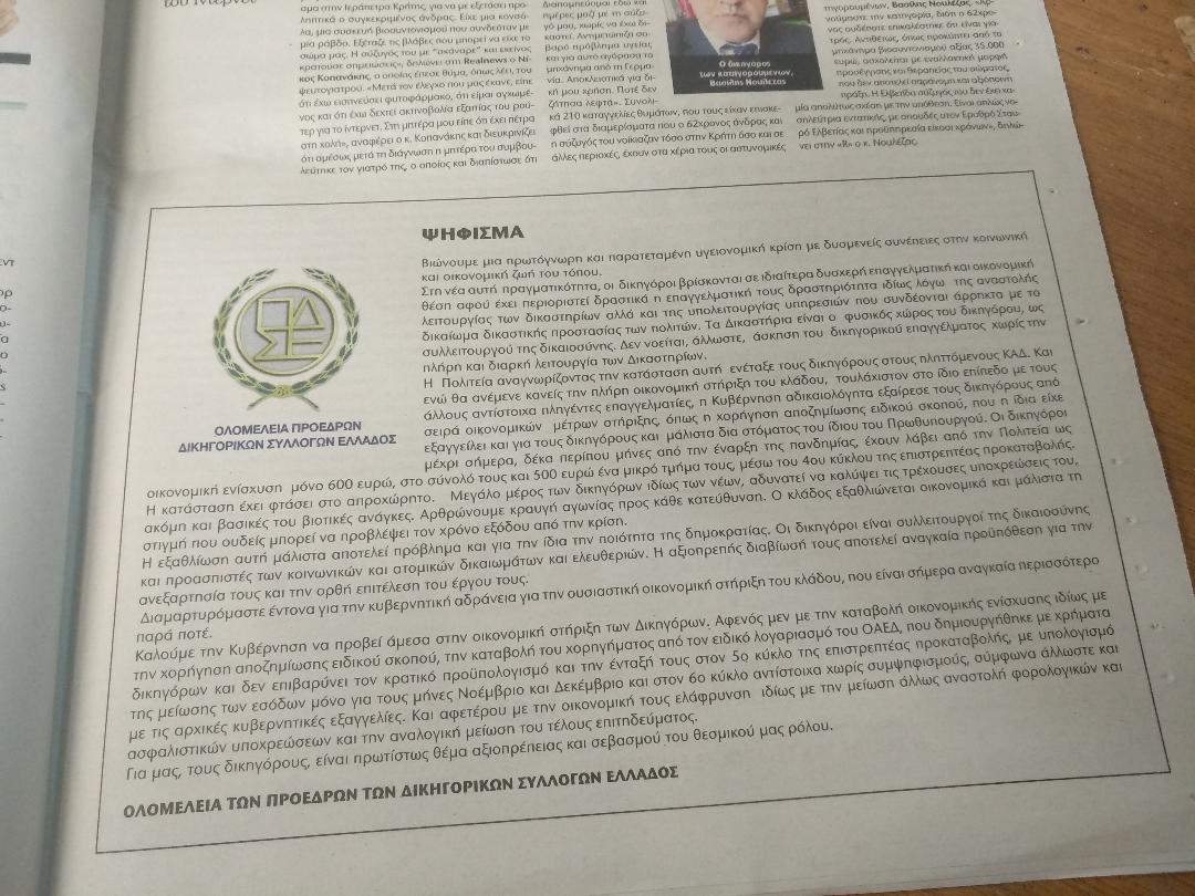Σε υλοποίηση απόφασης της Ολομέλειας των Προέδρων των Δικηγορικών Συλλόγων Ελλάδος, δημοσιεύθηκε σήμερα στην εφημεριδα REAL NEWS, ψήφισμα σχετικά με την ανάγκη άμεσης αντιμετώπισης οικονομικών και άλλων ζητημάτων που προκάλεσε (και συνεχίζει να προκαλεί) η πανδημία στους δικηγόρους.