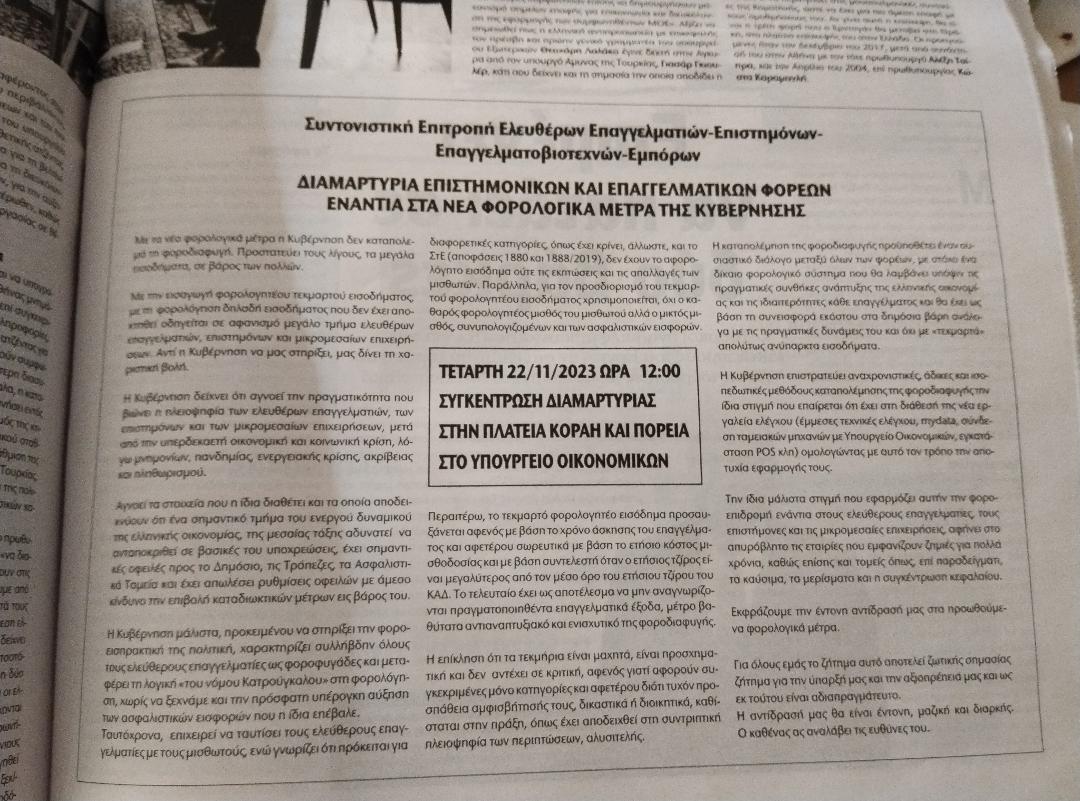 Η Συντονιστική Επιτροπή των Ελευθέρων Επαγγελματιών –Επιστημόνων –Επαγγελματοβιοτεχνών - Εμπόρων , την Δευτέρα 20 Νοεμβρίου 2023, διοργανώνει συνέντευξη για τα νέα φορολογικά μέτρα που ανακοίνωσε η κυβέρνηση και πλήττουν καίρια τους συγκεκριμένους κλάδους, στις 13.00, στα γραφεία του Βιοτεχνικού Επιμελητηρίου Αθηνών, Ακαδημίας 18.