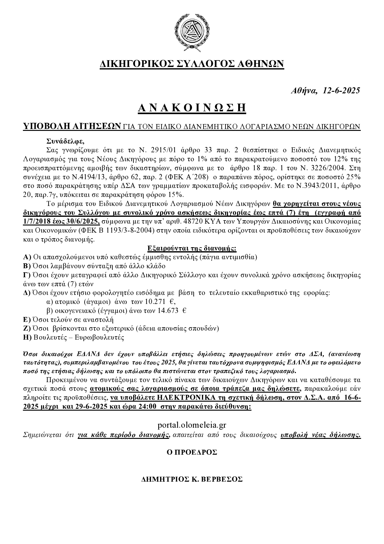 Προκειμένου να συντάξουμε τον τελικό πίνακα των δικαιούχων Δικηγόρων και να καταθέσουμε τα σχετικά ποσά στους ατομικούς σας λογαριασμούς σε όποια τράπεζα μας δηλώσετε, παρακαλούμε εάν πληροίτε τις προϋποθέσεις, να υποβάλετε ΗΛΕΚΤΡΟΝΙΚΑ τη σχετική δήλωση, στον Δ.Σ.Α. από 16-6-2025 μέχρι και 29-6-2025 και ώρα 24:00 στην παρακάτω διεύθυνση: portal.olomeleia.gr