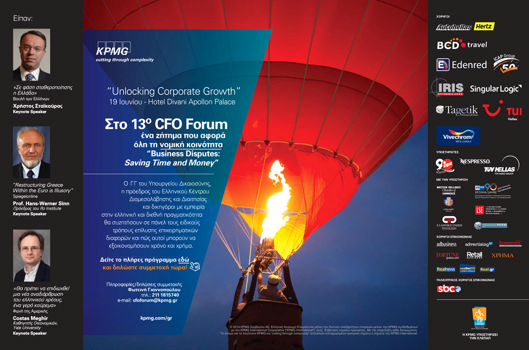 Η KPMG στην Ελλάδα ανακοινώνει τη διοργάνωστη του 13ου Συνεδρίου Οικονομικών Διευθυντών που θα πραγματοποιηθεί στις 19 Ιουνίου 2014, στο Ξενοδοχείο Divani Apollon Palace
