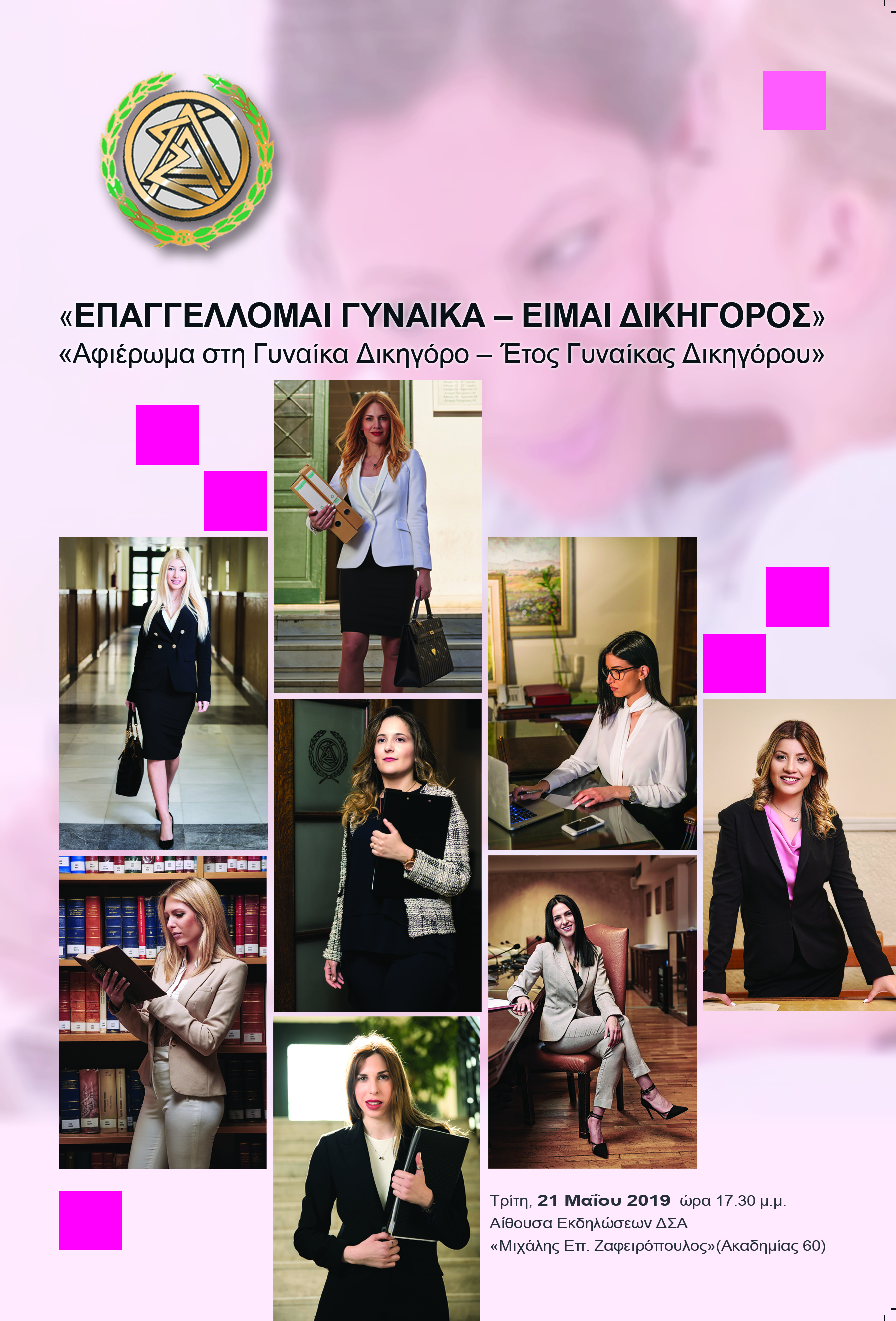 Εκδήλωση με θέμα «Επαγγέλλομαι Γυναίκα - Είμαι Δικηγόρος» διοργανώνει ο ΔΣΑ την Τρίτη, 21 Μαΐου 2019 και ώρα 17.30' στην αίθουσα εκδηλώσεων του Συλλόγου «Μιχάλης Επαμ. Ζαφειρόπουλος» (Ακαδημίας 60, 1ος όροφος).