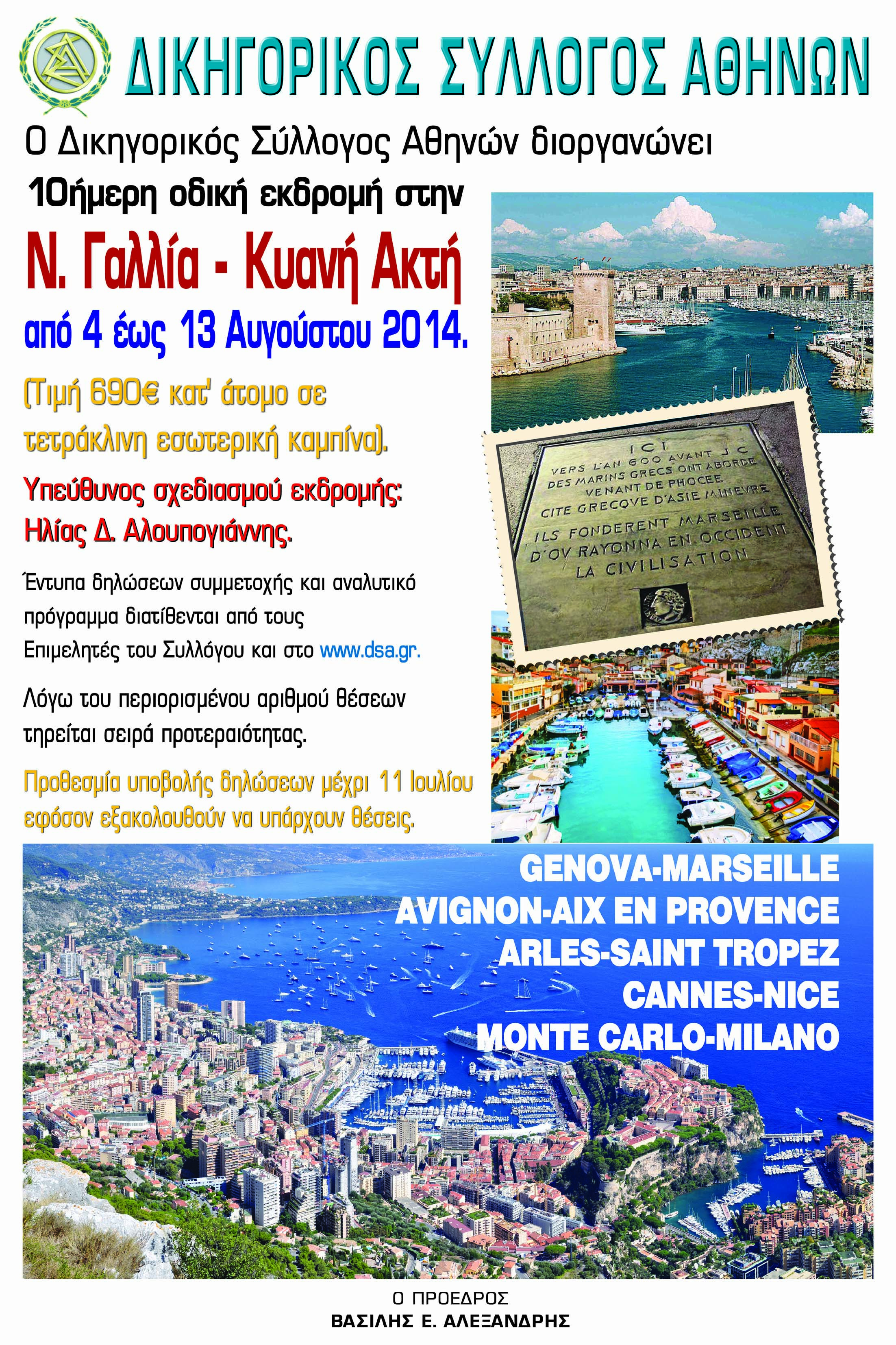 Από 4/08/2014 έως 13/08/2014 θα πραγματοποιηθεί δεκαήμερη εκδρομή στην Νότια Γαλλία- Κυανή Ακτή .