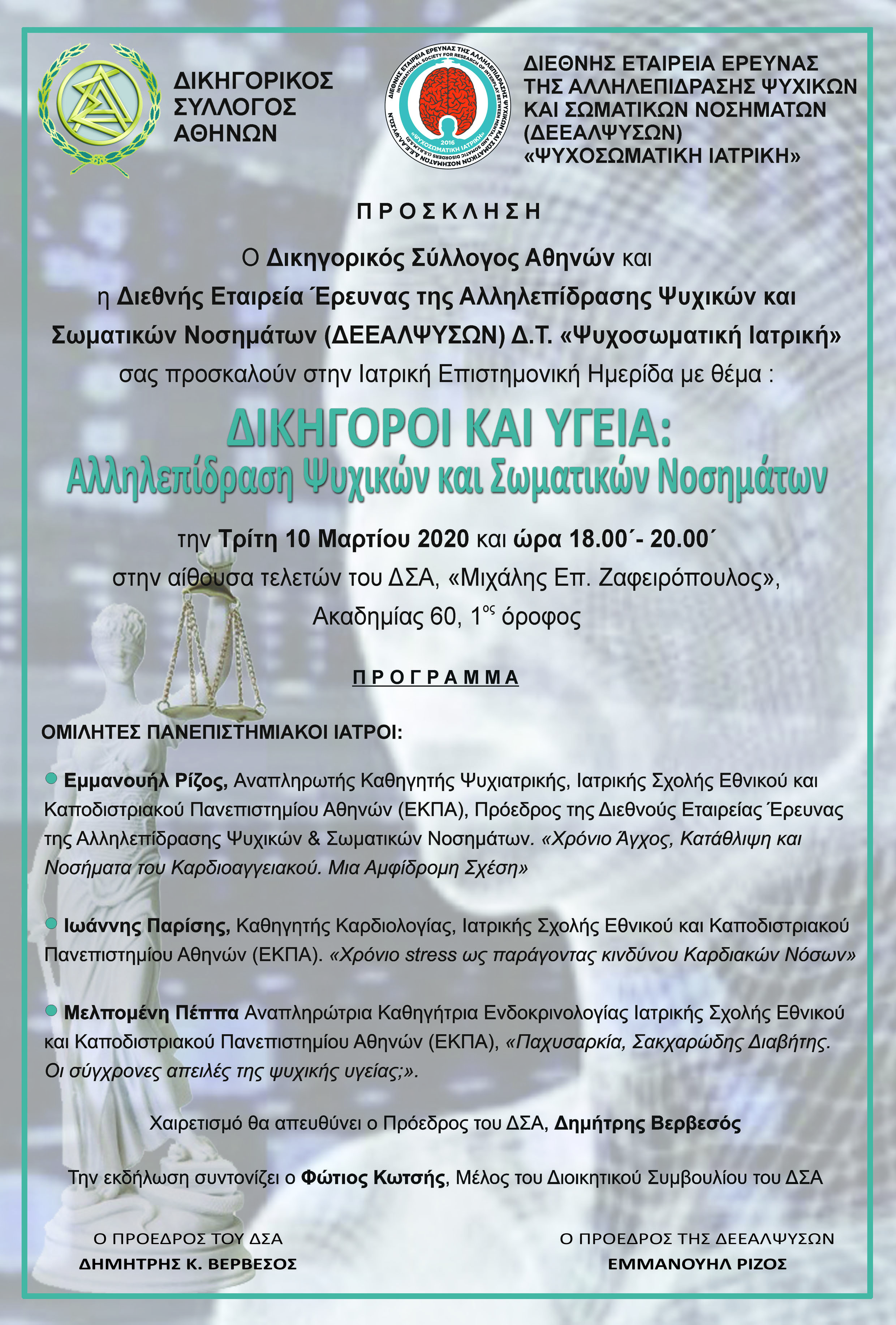 Ο Δικηγορικός Σύλλογος Αθηνών &η Διεθνής Εταιρεία Έρευνας της Αλληλεπίδρασης Ψυχικών και Σωματικών Νοσημάτων «Ψυχοσωματική Ιατρική» σας προσκαλούν στην Ιατρική Επιστημονική Ημερίδα με θέμα : ΔΙΚΗΓΟΡΟΙ ΚΑΙ ΥΓΕΙΑ : Αλληλεπίδραση Ψυχικών και Σωματικών Νοσημάτων την Τρίτη 10 Μαρτίου 2020 και ώρα 18.00΄- 20.00΄ στην αίθουσα τελετών του ΔΣΑ, «Μιχάλης Επ.Ζαφειρόπουλος», Ακαδημίας 60, 1ος όροφος --Επισυνάπτεται το πρόγραμμα της ημερίδας.