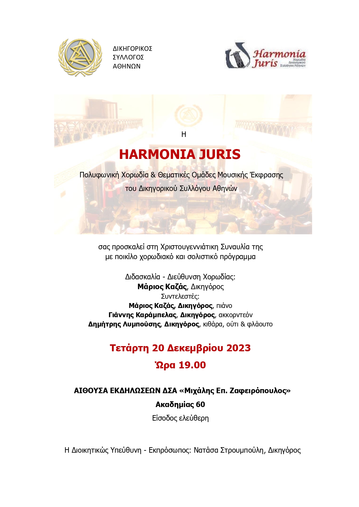 Η Χριστουγεννιάτικη συναυλία της HARMONIA JURIS θα πραγματοποιηθεί στην αίθουσα εκδηλώσεων του ΔΣΑ την Τετάρτη 20 Δεκεμβρίου 2023 στις 19.00.