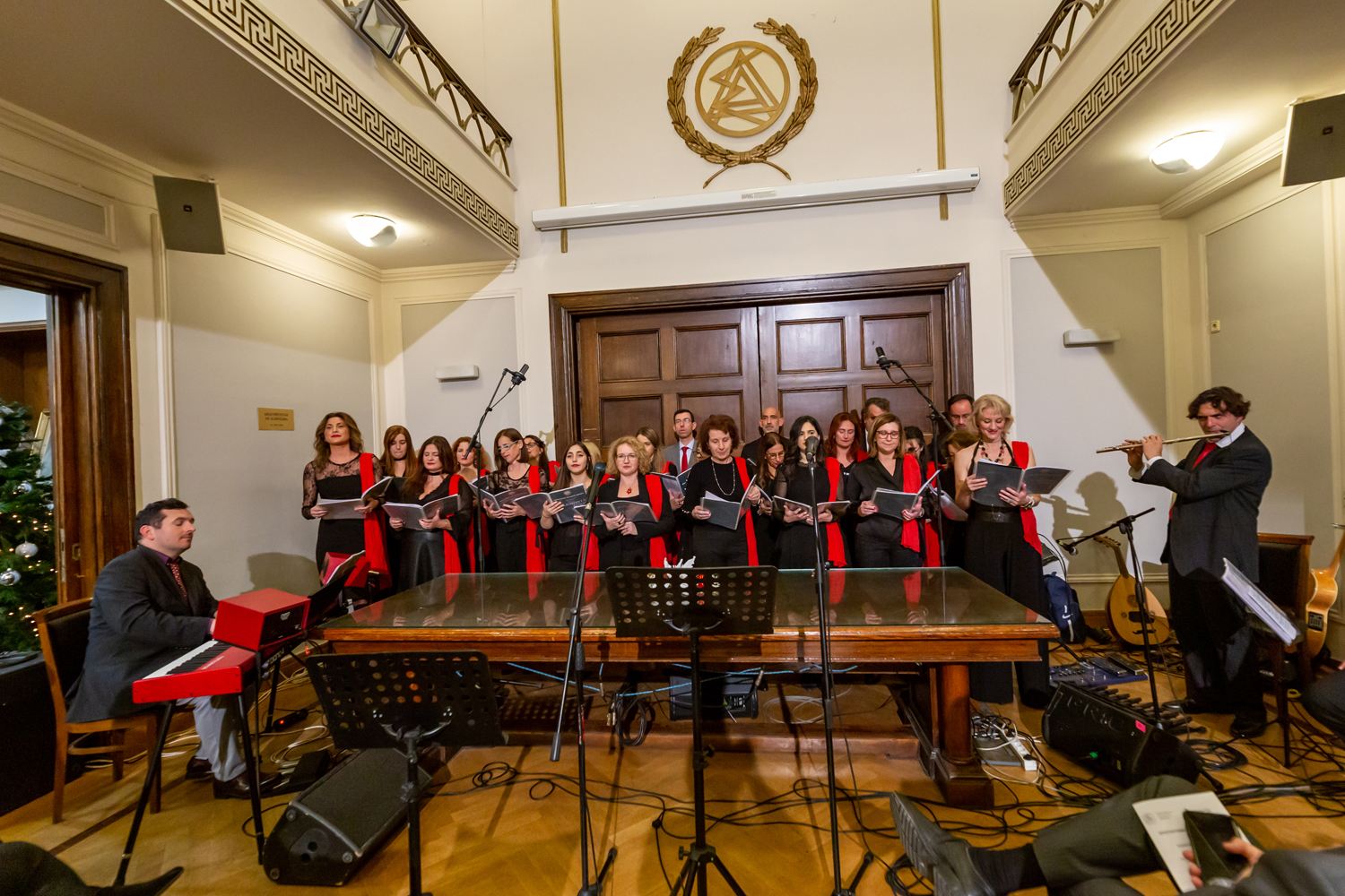 Η HARMONIA JURIS, η οποία ιδρύθηκε το έτος 2006 από την ε.τ. Δικηγόρο κ. Μαρία Ρενιέρη–Γιαννοπούλου, παρουσίασε το εορταστικό μουσικό πρόγραμμά της αποτελούμενο από ύμνους, κάλαντα και χριστουγεννιάτικα τραγούδια, ελληνικά και ξενόφωνα, εναρμονισμένα για τετράφωνη χορωδία σε μουσική διδασκαλία και διεύθυνση του Μαέστρου της κ. Μάριου Καζά, Δικηγόρου, ο οποίος τη συνόδευσε στο πιάνο, και με τη συνοδεία των συναδέλφων Δικηγόρων κκ. Γιάννη Καράμπελα στο ακκορντεόν και Δημήτρη Λυμπούση στην κιθάρα, το ούτι, τα synthesizers και το φλάουτο.
