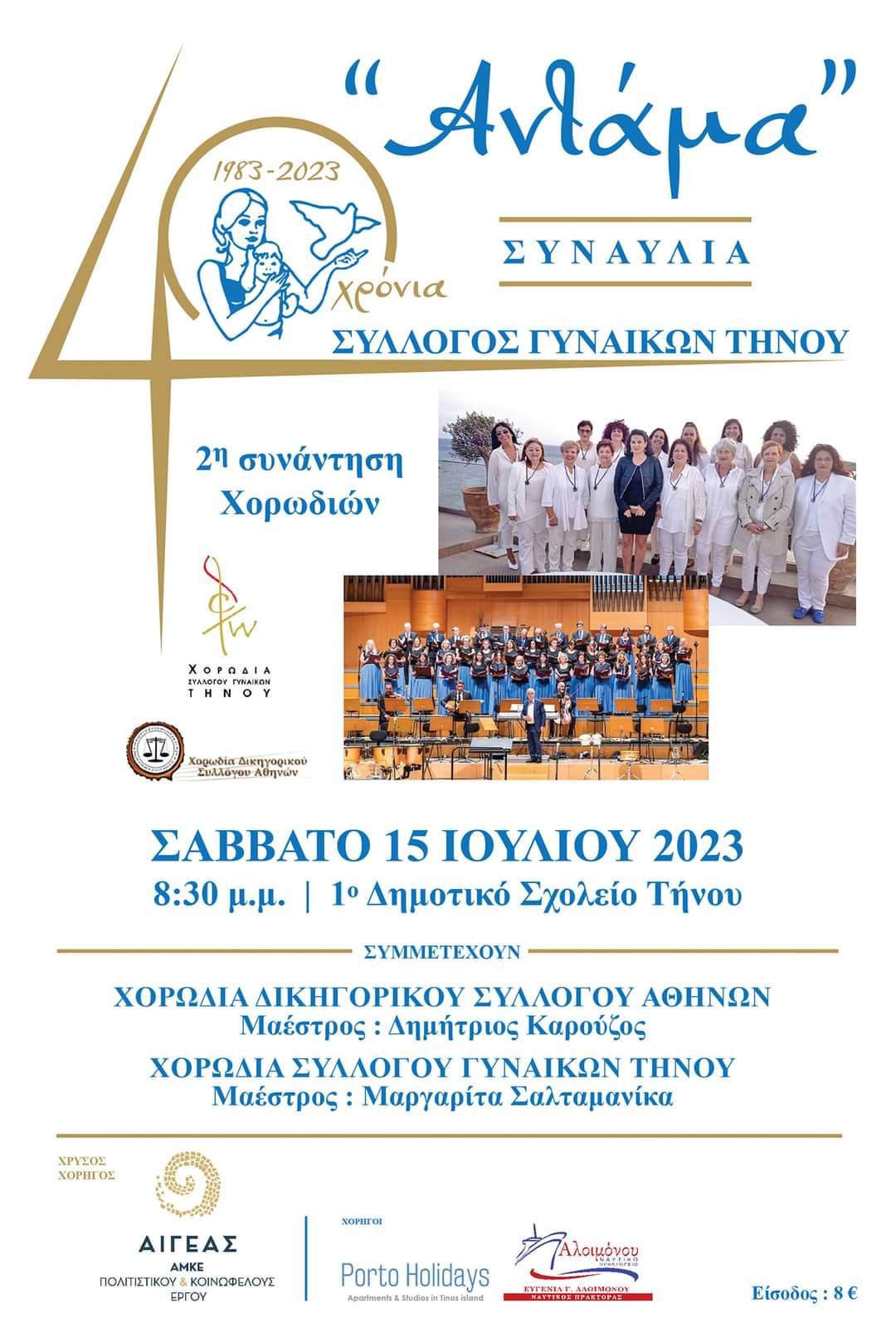 Η Χορωδία του ΔΣΑ, προσκεκλημένη από το ΔΣ του Συλλόγου Γυναικών Τήνου, έχει την τιμή να συμμετάσχει στην 2η συνάντηση χορωδιών που διοργανώνει ο Σύλλογος Γυναικών Τήνου το Σάββατο 15.7.2023 και ωρα 19:30 στην πόλη της Τήνου.