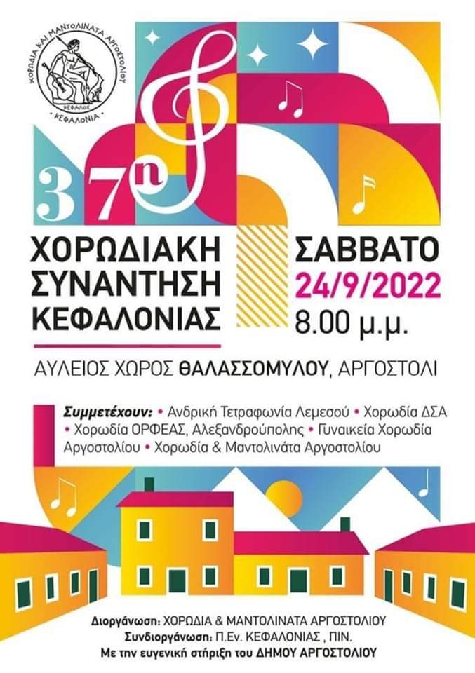Η Χορωδία του ΔΣΑ σε Διδασκαλία και Διεύθυνση του Μαέστρου της κ. Δημητρίου Καρούζου, Δικηγόρου και Καθηγητή μουσικής, με ιδιαίτερη ευχαρίστηση και τιμή αποδέχτηκε την πρόσκληση της Χορωδίας και Μαντολινάτων Αργοστολίου να λάβει μέρος στην 37η ΧΟΡΩΔΙΑΚΗ ΣΥΝΑΝΤΗΣΗ ΚΕΦΑΛΟΝΙΑΣ που διοργανώνει στο Αργοστόλι η Χορωδία και Μαντολινάτα Αργοστολίου με την συνδιοργάνωση της Π.Εν. ΚΕΦΑΛΟΝΙΑΣ και με την ευγενική στήριξη του ΔΗΜΟΥ ΑΡΓΟΣΤΟΛΙΟΥ, που θα πραγματοποιηθεί το Σάββατο 24 Σεπτεμβρίου 2022 στον Αύλειο χώρο Θαλασσόμυλου στο Αργοστόλι.