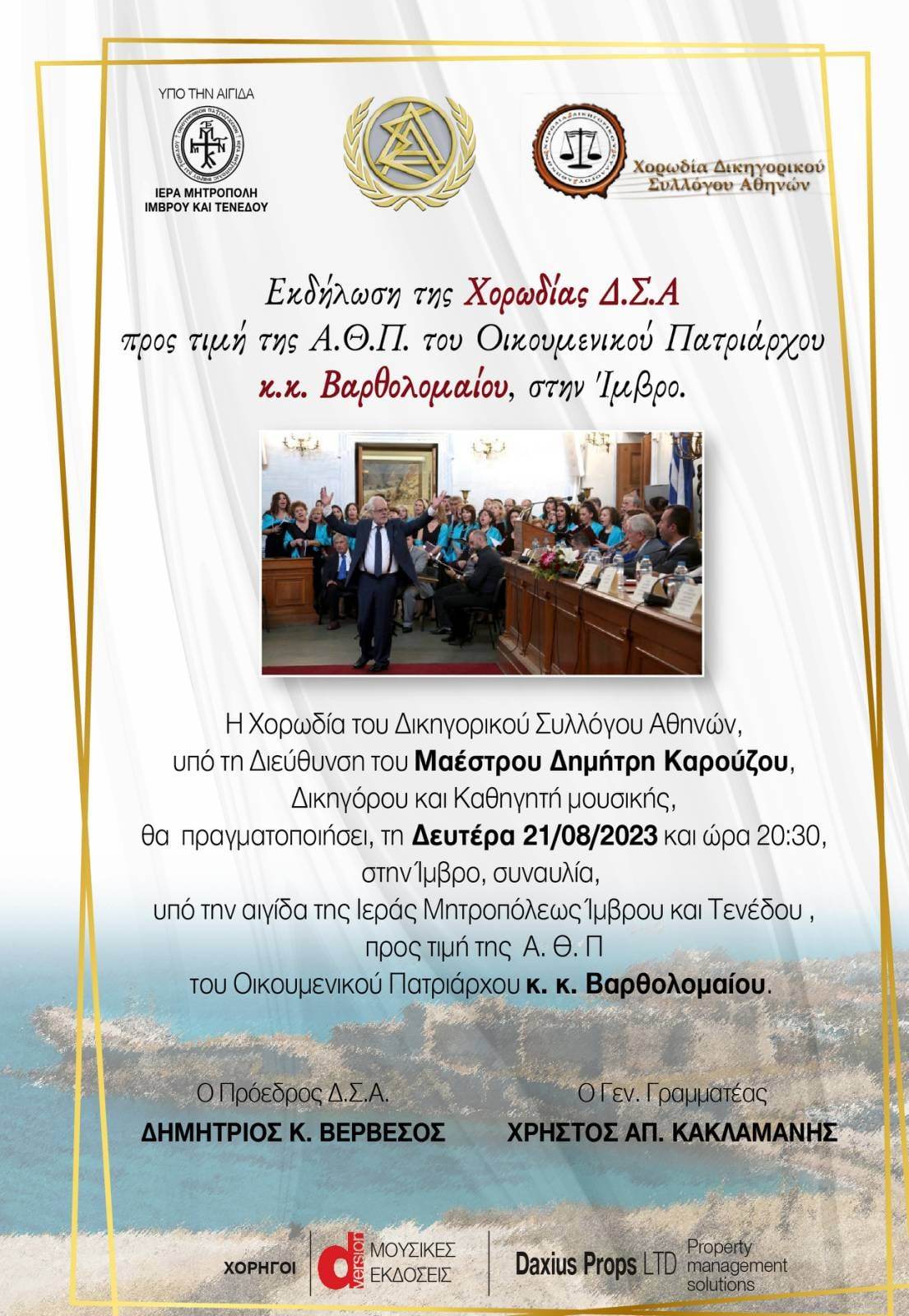 Η Χορωδία του ΔΣΑ σε Διδασκαλία και Διεύθυνση του Μαέστρου της Δημήτρη Καρούζου, Δικηγόρου και Καθηγητή μουσικής, έχει την ιδιαίτερη τιμή να πραγματοποιήσει συναυλία προς τιμή της Α. Θ. Π του Οικουμενικού Πατριάρχου κ. κ. Βαρθολομαίου του Ιμβρίου και υπό την ΑΙΓΙΔΑ της Ιεράς Μητροπόλεως ΙΜΒΡΟΥ και ΤΕΝΕΔΟΥ, τη Δευτέρα 21/08/2023 και ώρα 20:30 στην Ίμβρο.