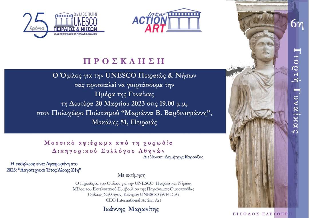 Η Χορωδία του ΔΣΑ, κατόπιν πρόσκλησής της από τον Όμιλο UNESCO Πειραιώς και Νήσων”, θα τιμήσει τη γυναίκα με τις μελωδίες της, σε εκδήλωση αφιερωμένη στην Ημέρα της Γυναίκας, στον Πολυχώρο Πολιτισμού “Μαριάννα Β. Βαρδινογιάννη” (Μυκάλης 51, Πειραιάς) τη Δευτέρα 20.3.2023 και ώρα 19:00.