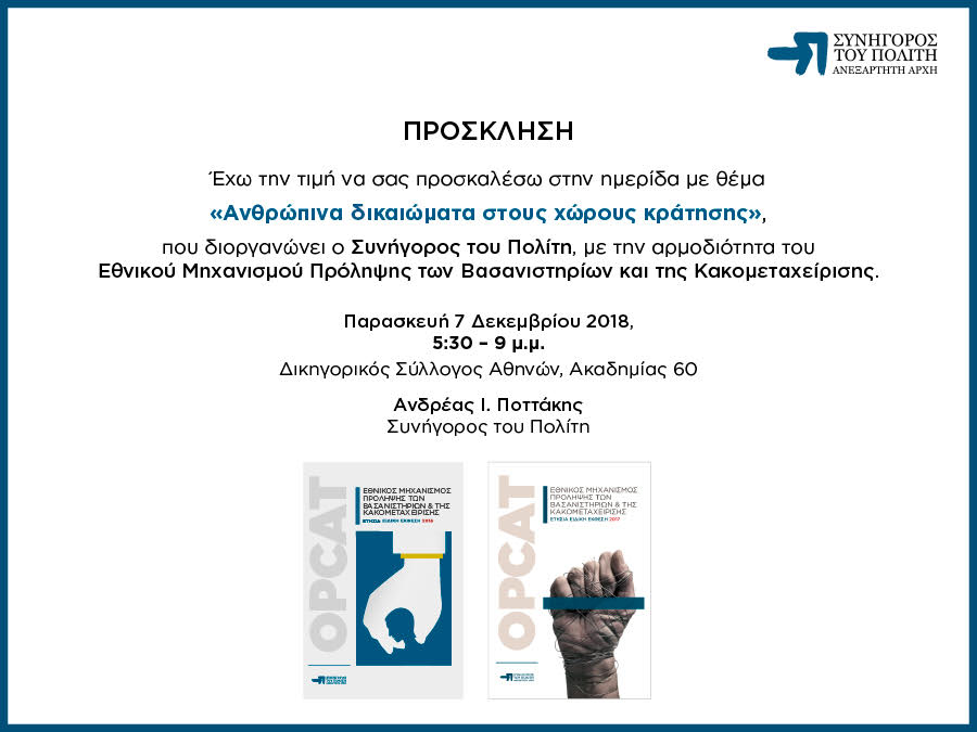 Ημερίδα με θέμα «Ανθρώπινα δικαιώματα στους χώρους κράτησης» διοργανώνει ο Συνήγορος του Πολίτη την Παρασκευή, 7 Δεκεμβρίου 2018.