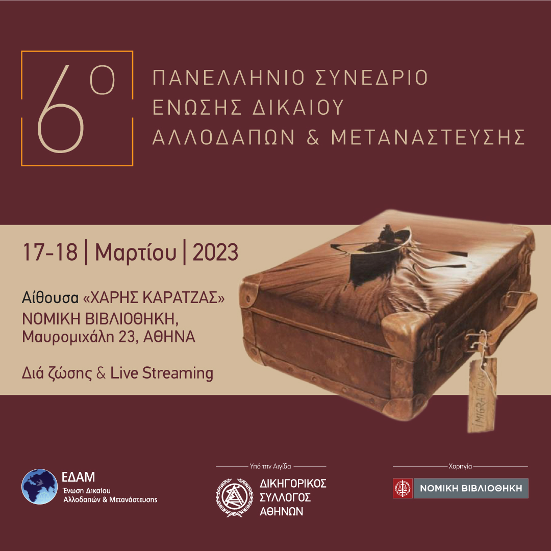 Η Ένωση Δικαίου Αλλοδαπών και Μετανάστευσης (ΕΔΑΜ) υπό την αιγίδα του Δικηγορικού Συλλόγου Αθηνών διοργανώνουν την Παρασκευή 17 και το Σάββατο 18 Μαρτίου το 6ο Πανελλήνιο Συνέδριο για θέματα δικαίου μετανάστευσης, ασύλου και ιθαγένειας στο σταυροδρόμι μιας νέας εποχής, όπως διαμορφώθηκε μετά την πανδημία, τις αυξημένες μεταναστευτικές και προσφυγικές ροές και την ανάληψη νέων και κρίσιμων νομοθετικών πρωτοβουλιών ειδικά στον τομέα του ασύλου.