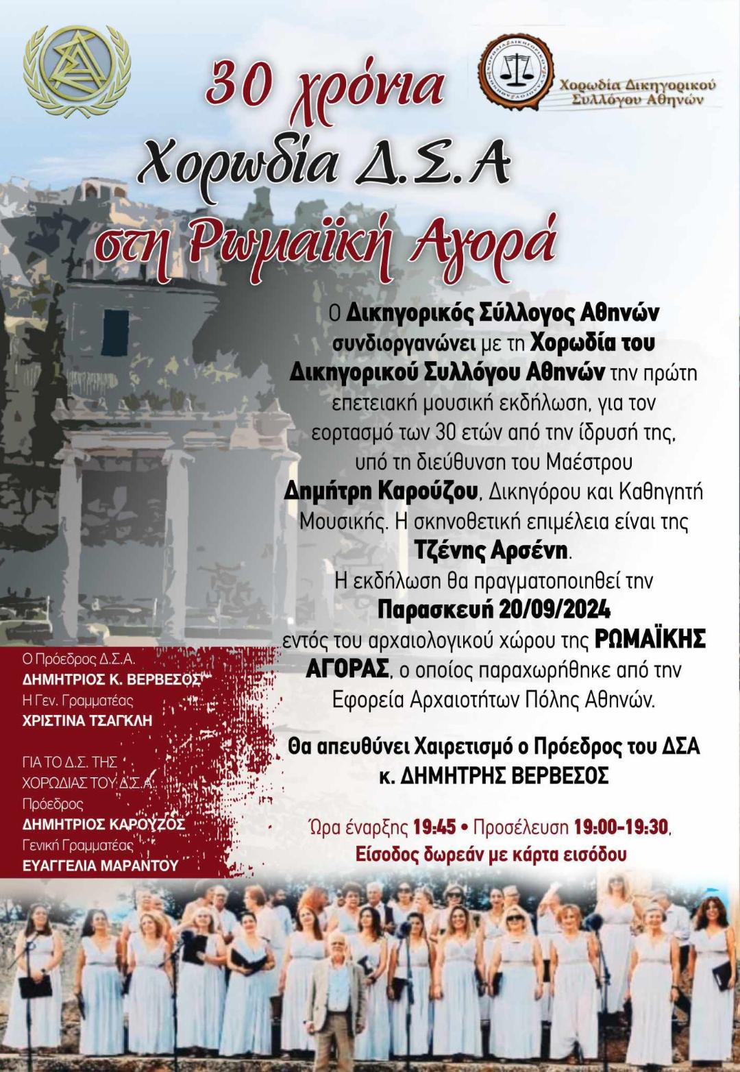 Μουσική εκδήλωση,ΣΗΜΕΡΑ, στον αρχαιολογικό χώρο της ΡΩΜΑΪΚΗΣ ΑΓΟΡΑΣ, για τον εορτασμό των 30 ετών από την ίδρυση της Χορωδίας του ΔΣΑ