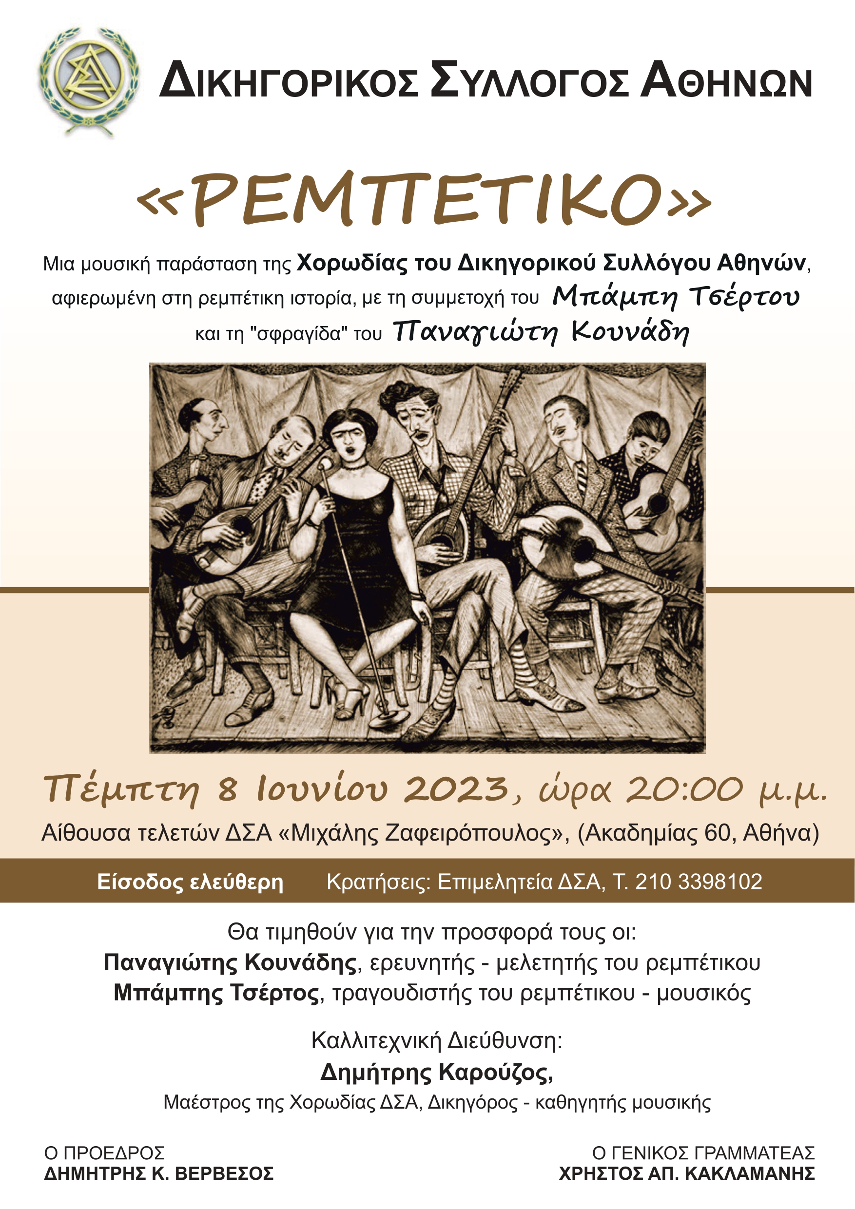 Ο ΔΣΑ με την Χορωδία του ΔΣΑ διοργανώνουν την Πέμπτη 8.6.2023 και ώρα 20:00 στην αίθουσα τελετών «Μιχάλης Ζαφειρόπουλος» την πρώτη στα χρονικά μουσική χορωδιακή παράσταση αφιερωμένη στο ΡΕΜΠΕΤΙΚΟ , με τη συμμετοχή του μουσικού-τραγουδιστή του ρεμπέτικου Μπάμπη Τσέρτου και τη «σφραγίδα» του ερευνητή-μελετητή του ρεμπέτικου Παναγιώτη Κουνάδη.
