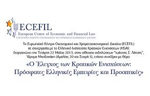Το Ευρωπαϊκό Κέντρο Οικονομικού και Χρηματοοικονομικού Δικαίου (ECEFIL), σε συνεργασία με το Ελληνικό Ινστιτούτο Κρατικών Ενισχύσεων (HSAI), σας προσκαλεί στο τρίτο ετήσιο συνέδριό του με θέμα «Ο Έλεγχος των κρατικών Ενισχύσεων: Πρόσφατες Ελληνικές Εμπειρίες και Προοπτικές» που θα πραγματοποιηθεί την Τετάρτη 22 Μαΐου 2013, 17.30-21.30 στο Ίδρυμα Μποδοσάκη στην αίθουσα εκδηλώσεων «Ιωάννης Σ. Λάτσης» (Αμαλίας 20 και Σουρή 5).