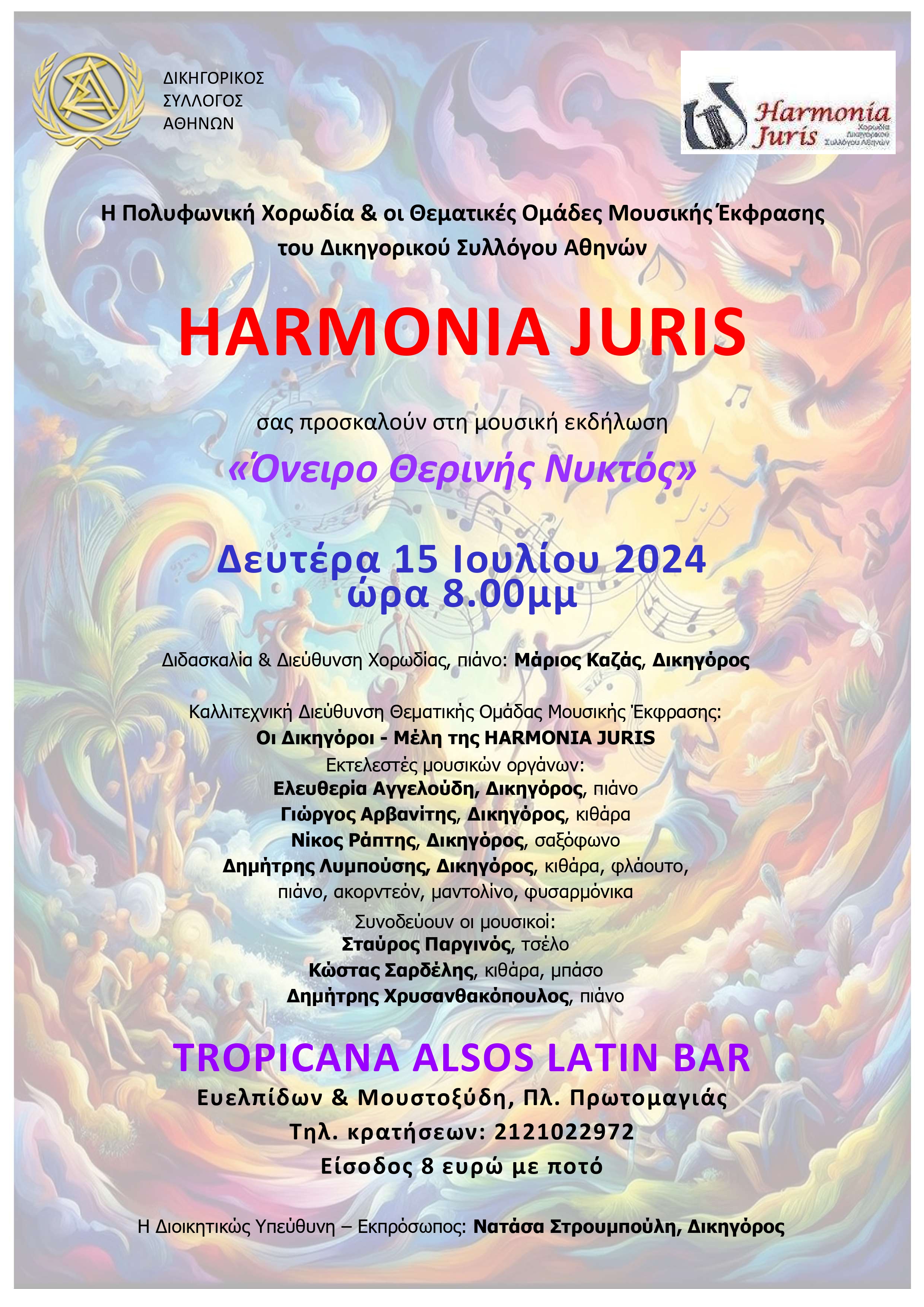 Mουσική εκδήλωση "ΟΝΕΙΡΟ ΘΕΡΙΝΗΣ ΝΥΚΤΟΣ", στο κλείσιμο του δικαστικού έτους, διοργανωνει η Πολυφωνική Χορωδία και οι Θεματικές Ομάδες Μουσικής Έκφρασης HARMONIA JURIS του ΔΣΑ, την ερχόμενη Δευτέρα 15-7-2024 και ώρα 8.00μμ στο TROPICANA ALSOS (Ευελπίδων & Μουστοξύδη, Πλατεία Πρωτομαγιάς),