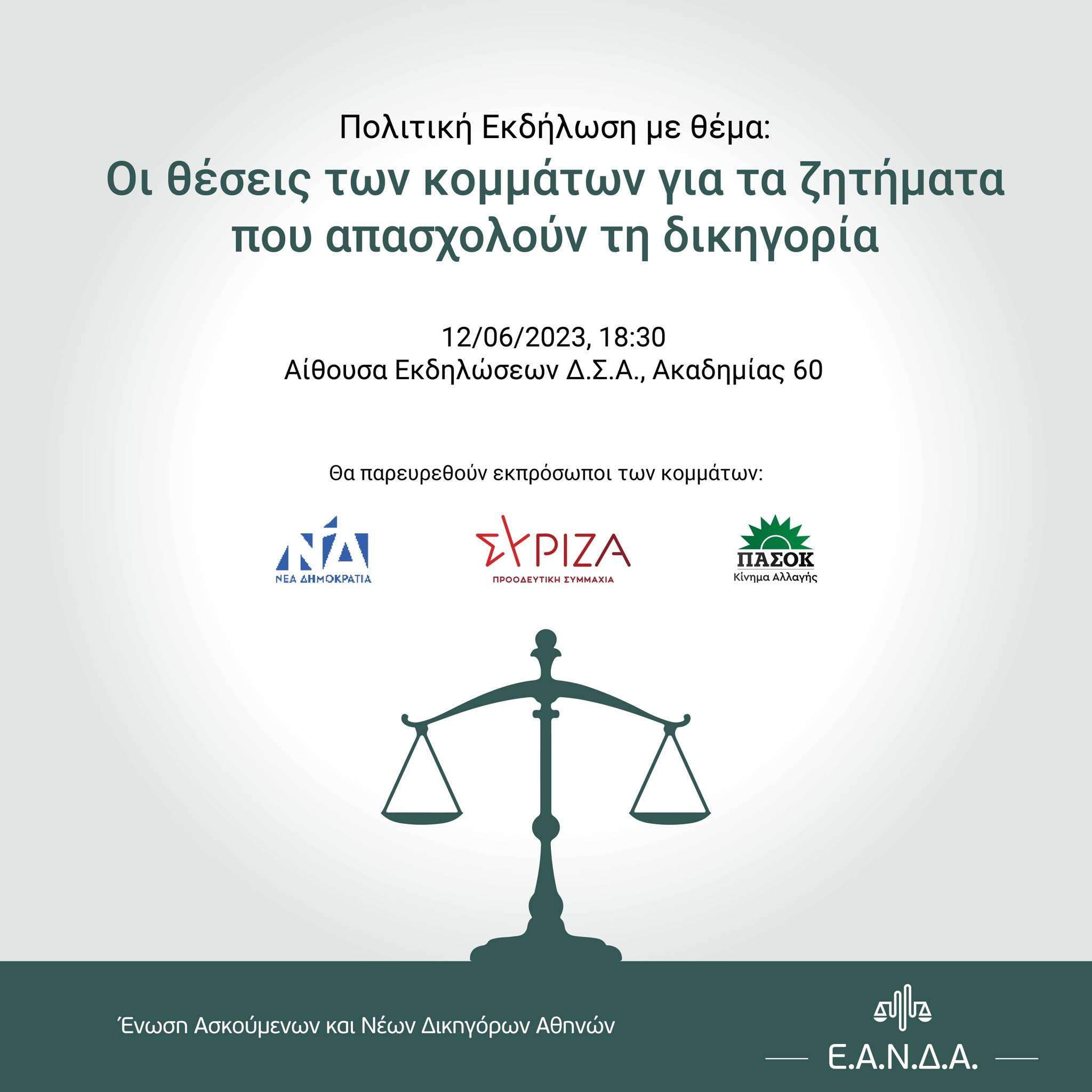 Αγαπητοί συνάδελφοι, σας προσκαλούμε στην εκδήλωση που διοργανώνουμε με θέμα: Οι θέσεις των πολιτικών κομμάτων για τα ζητήματα που αφορούν την δικηγορία, η οποία θα διεξαχθεί την Δευτέρα, 12/6 και ώρα 18:30 στον Δικηγορικό Σύλλογο Αθηνών