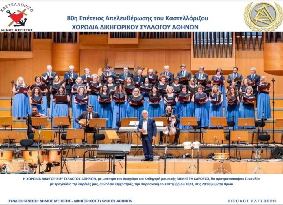Η Χορωδία ΔΣΑ σε Διδασκαλία και Διεύθυνση του Μαέστρου της Δημήτρη Καρούζου, Δικηγόρου και Καθηγητή μουσικής, έχει την ιδιαίτερη τιμή και χαρά να πραγματοποιήσει συναυλία στο ακριτικό ΚΑΣΤΕΛΛΌΡΙΖΟ , ύστερα από πρόσκληση του Δήμου Μεγίστης.