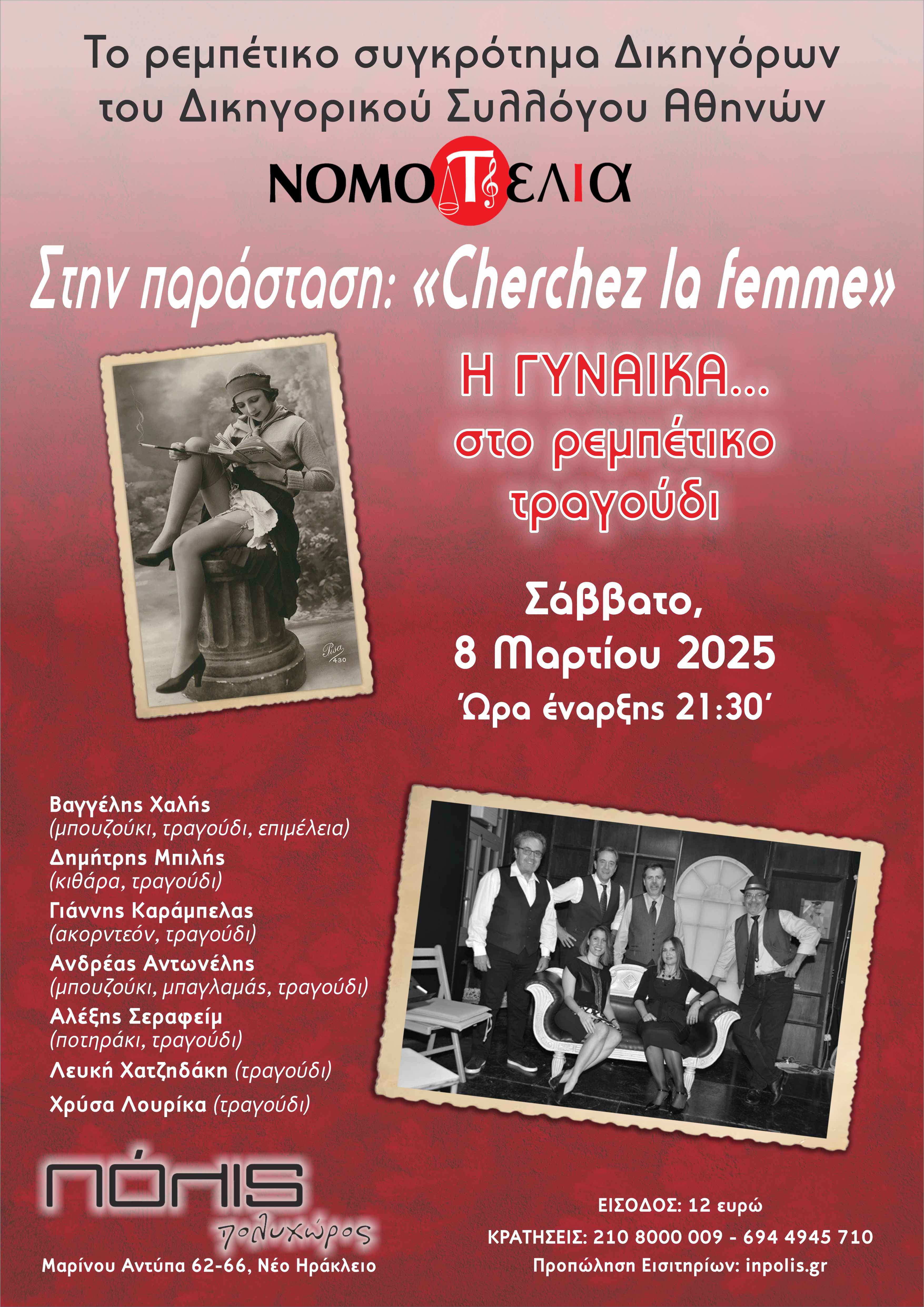 Το ρεμπέτικο συγκρότημα δικηγόρων του ΔΣΑ παρουσιάζει ειδικό αφιέρωμα στην ΓΥΝΑΙΚΑ, όπως την τραγούδησαν οι ρεμπέτες.
