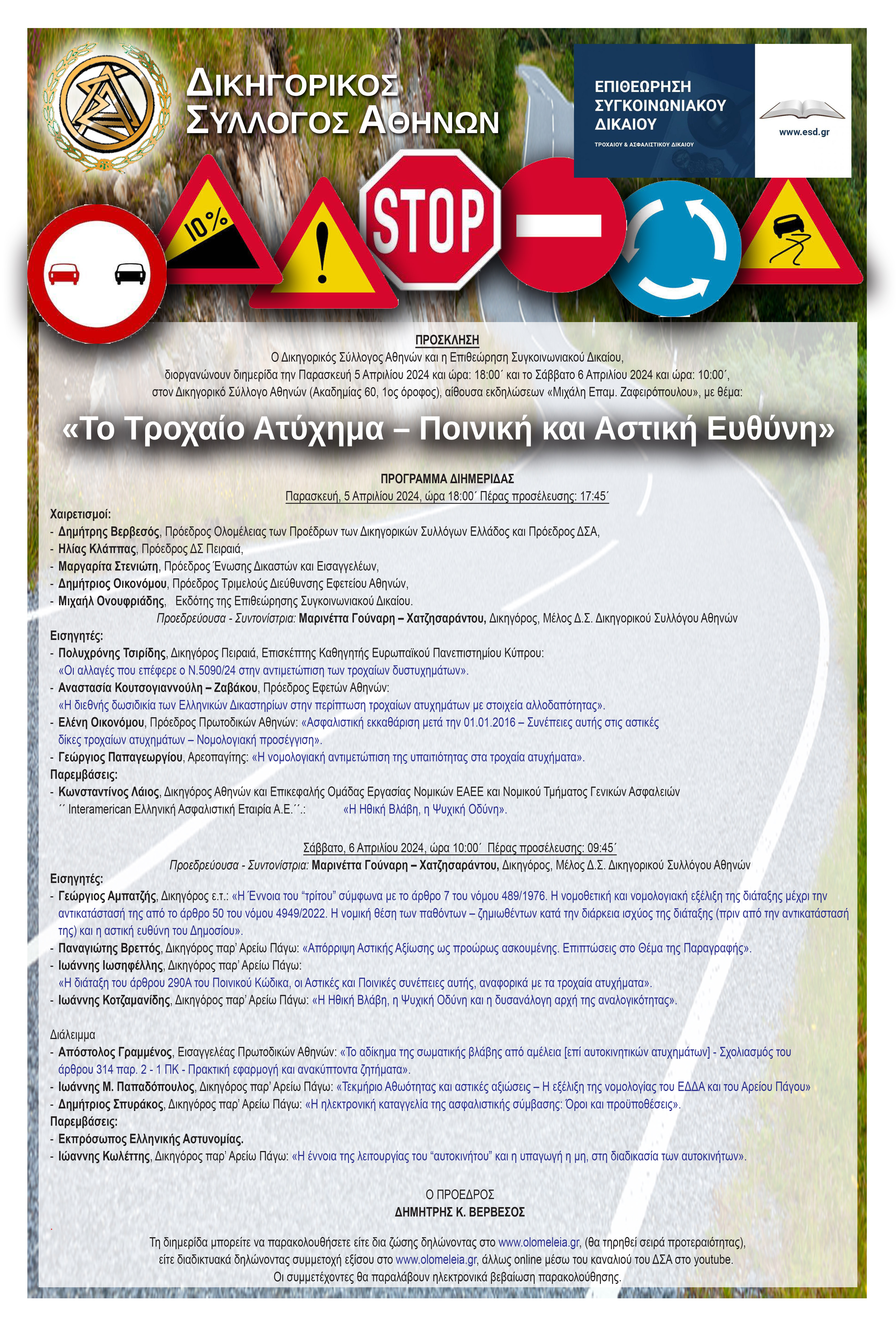 Ο Δικηγορικός Σύλλογος Αθηνών και η Επιθεώρηση Συγκοινωνιακού Δικαίου, διοργανώνουν διημερίδα την Παρασκευή 5 Απριλίου 2024 και ώρα: 18:00΄ και το Σάββατο 6 Απριλίου 2024 και ώρα: 10:00΄, στον Δικηγορικό Σύλλογο Αθηνών (Ακαδημίας 60, 1ος όροφος), αίθουσα εκδηλώσεων «Μιχάλη Επαμ. Ζαφειρόπουλου», με θέμα: