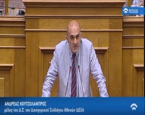 Κατά τη συζήτηση στην αρμόδια Επιτροπή της Βουλής του Νομοσχεδίου του Υπουργείου Εργασίας στις 3.7.2018 παρέστη και εκπροσώπησε τον ΔΣΑ ο Σύμβουλος, κ. Ανδρέας Κουτσόλαμπρος, ο οποίος έθεσε συνοπτικά τα εξής ζητήματα: