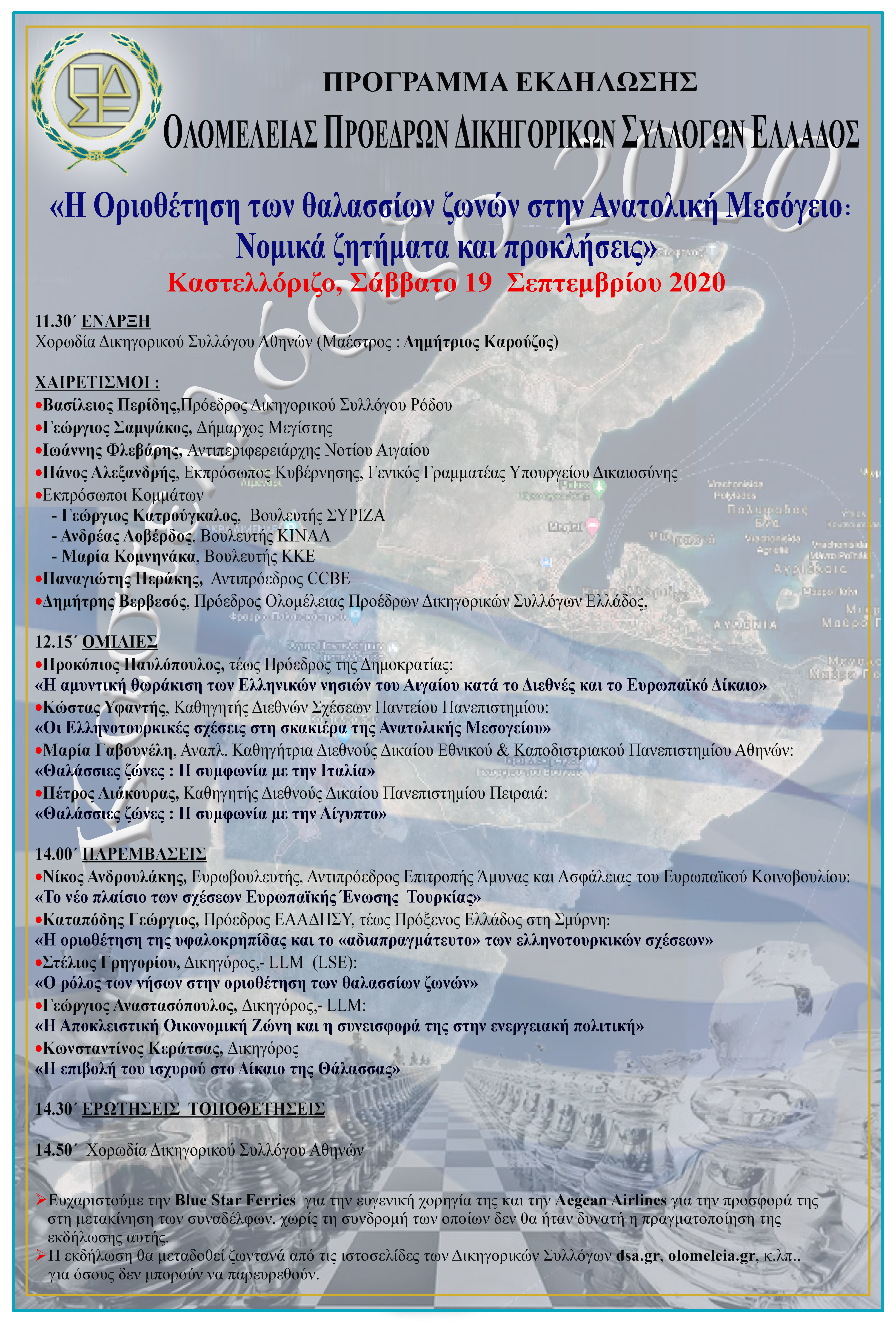 Το επίκαιρο ζήτημα της οριοθέτησης των θαλασσίων ζωνών στην Ανατολική Μεσόγειο εξετάζει η εκδήλωση που θα πραγματοποιηθεί στις 19 Σεπτεμβρίου 2020 και ώρα 11.30΄ με διοργανωτή την Ολομέλεια των Προέδρων των Δικηγορικών Συλλόγων Ελλάδος. Η εκδήλωση θα πραγματοποιηθεί στο Καστελόριζο και θα μεταδοθεί ζωντανά.