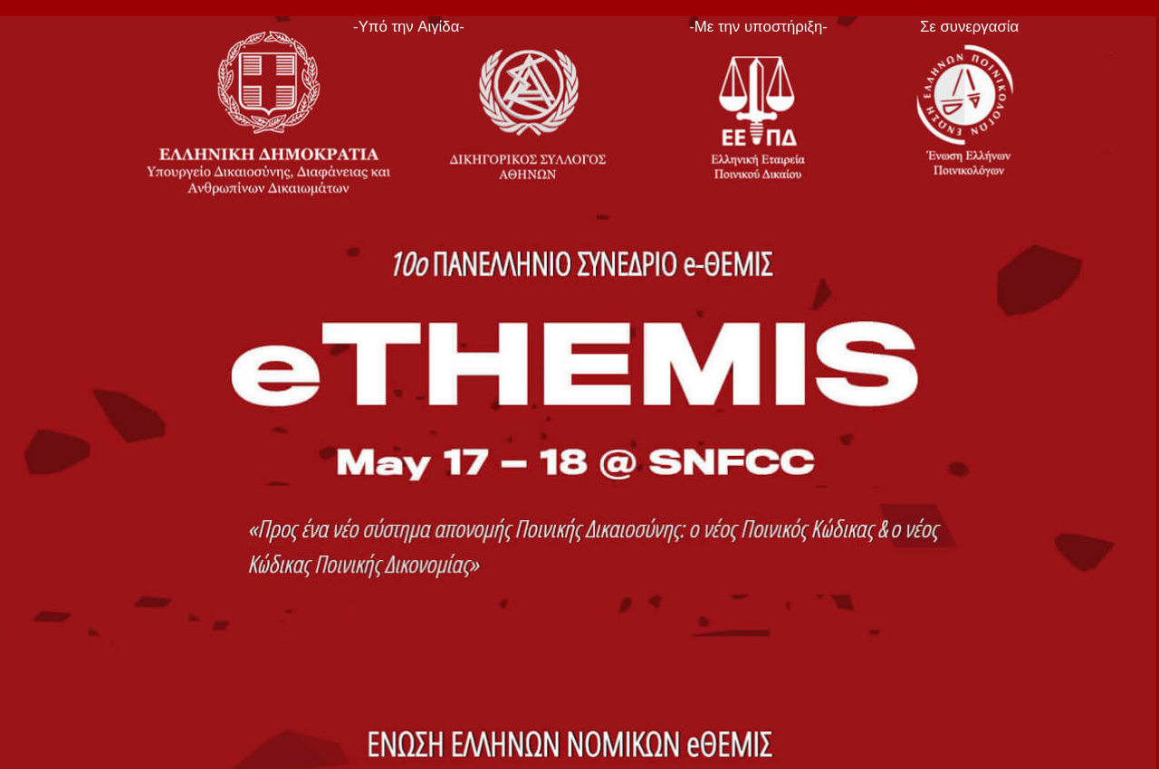 «Προς ένα νέο σύστημα απονομής ποινικής δικαιοσύνης – Ο νέος Ποινικός Κώδικας και ο νέος Κώδικας Ποινικής Δικονομίας» 10ο Πανελλήνιο Συνέδριο Ε.Ε.Ν.e-Θέμις 17-18 Μαΐου 2019 - Κέντρο Πολιτισμού Ίδρυμα Σταύρος Νιάρχος Κτίριο Εθνικής Λυρικής Σκηνής - Επίπεδο 5Α Η Ένωση Ελλήνων Νομικών e-Θέμις, σε συνεργασία με την Ένωση Ελλήνων Ποινικολόγων και την υποστήριξη της Ελληνικής Εταιρείας Ποινικού Δικαίου, διοργανώνει το 10ο Πανελλήνιο Συνέδριο της στο «Κ.Π.Ι.Σ.Ν.», με θέμα «Προς ένα νέο σύστημα απονομής ποινικής δικαιοσύνης – Ο νέος Ποινικός Κώδικας και ο νέος Κώδικας Ποινικής Δικονομίας» στις 17 & 18 Μαΐου 2019.
