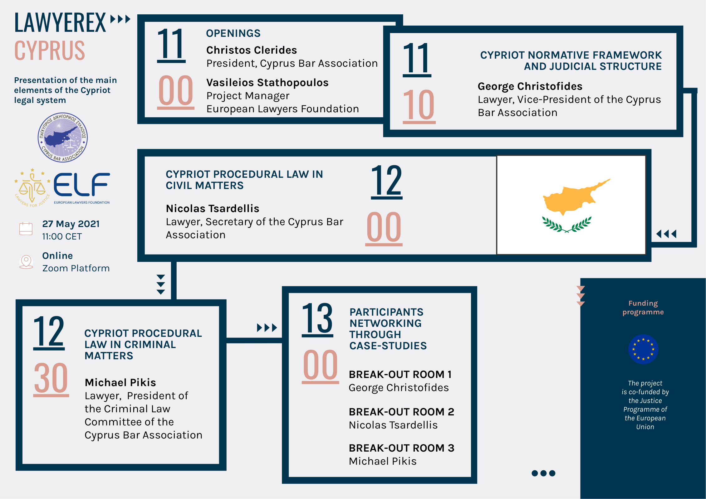 Το σεμινάριο θα έχει τρίωρη διάρκεια , θα παρουσιαστεί στην αγγλική γλώσσα και θα περιλαμβάνει εισαγωγή στο δικαστικό σύστημα της Κύπρου, με ειδική αναφορά στο ισχύον αστικό και ποινικό δικονομικό πλαίσιο· θα ακολουθήσει εργαστήριο με case studies, ενώ παράλληλα θα υπάρξει δυνατότητα δικτύωσης των συμμετεχόντων (οι οποίοι θα προέρχονται από τα 9 συμμετέχοντα ευρωπαϊκά κράτη).